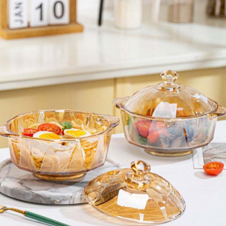 ชามแก้วคริสตัลสีเหลืองอำพันสำหรับใส่บะหมี่กึ่งสำเร็จรูป ชามสลัด มีฝาปิด หูจับสองข้าง สีเหลืองน้ำตาล สำหรับใช้ในบ้าน ขายส่ง