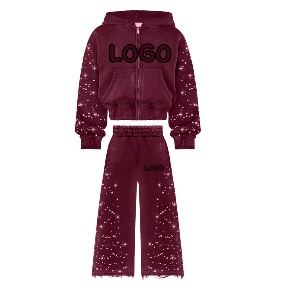 Wholesale Diamond Rhinestone Work Vintage Breathable Drop Shoulder Distressed Patch Embroidery Work Zip Up Men's Tracksuits