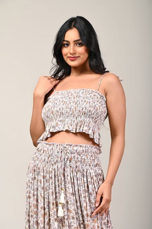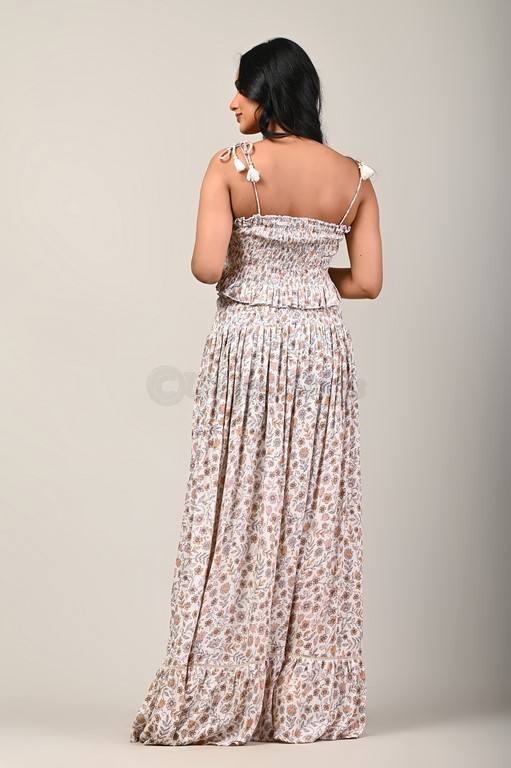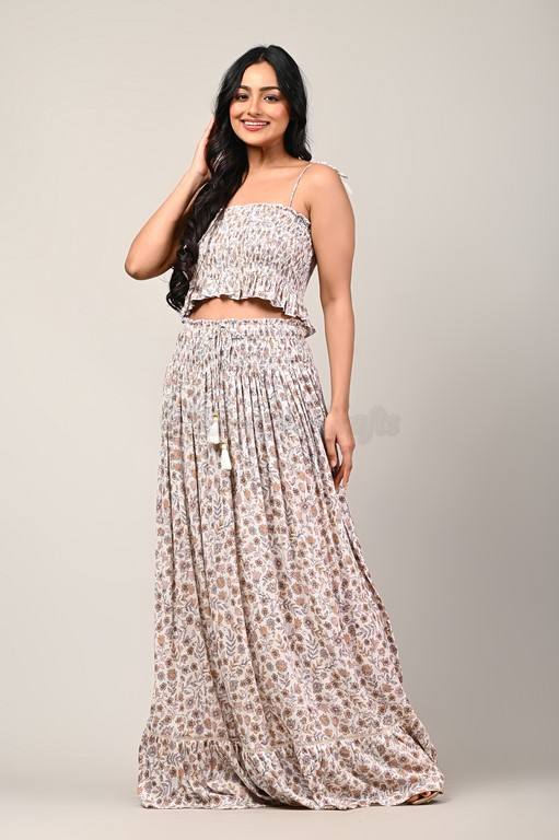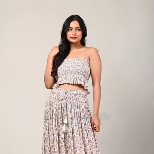กระโปรงผูกไหล่พิมพ์ลายดิจิตอลแบบตะวันตกและด้านบนด้านหน้าหลังสูบบุหรี่เพิ่มพู่และลูกไม้โดยผู้ผลิตอินเดีย
