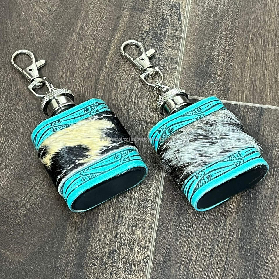 ขายส่งจากโรงงานโดยตรง กระติกน้ำขนาดเล็กแบบพกพา หนังวัวแท้สีเทอร์ควอยซ์ พร้อมพวงกุญแจหนัง สำหรับใส่ไวน์ เหมาะสำหรับเป็นของขวัญ