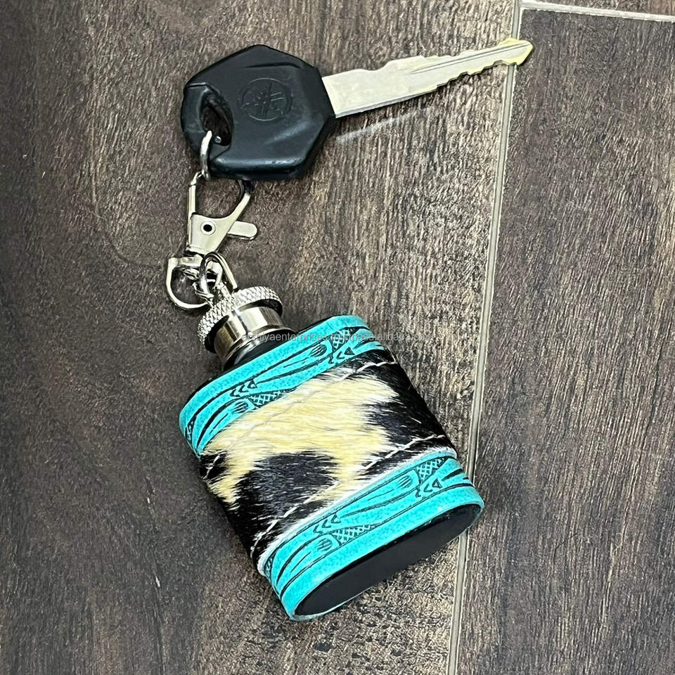 ขวดเหล้าสแตนเลสสตีลหุ้มหนังวัวแท้ทำมือ พร้อมพวงกุญแจ