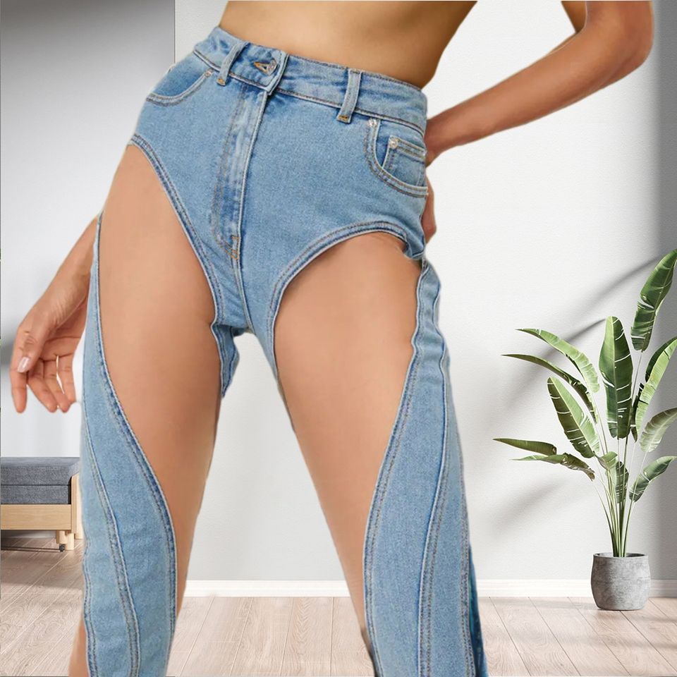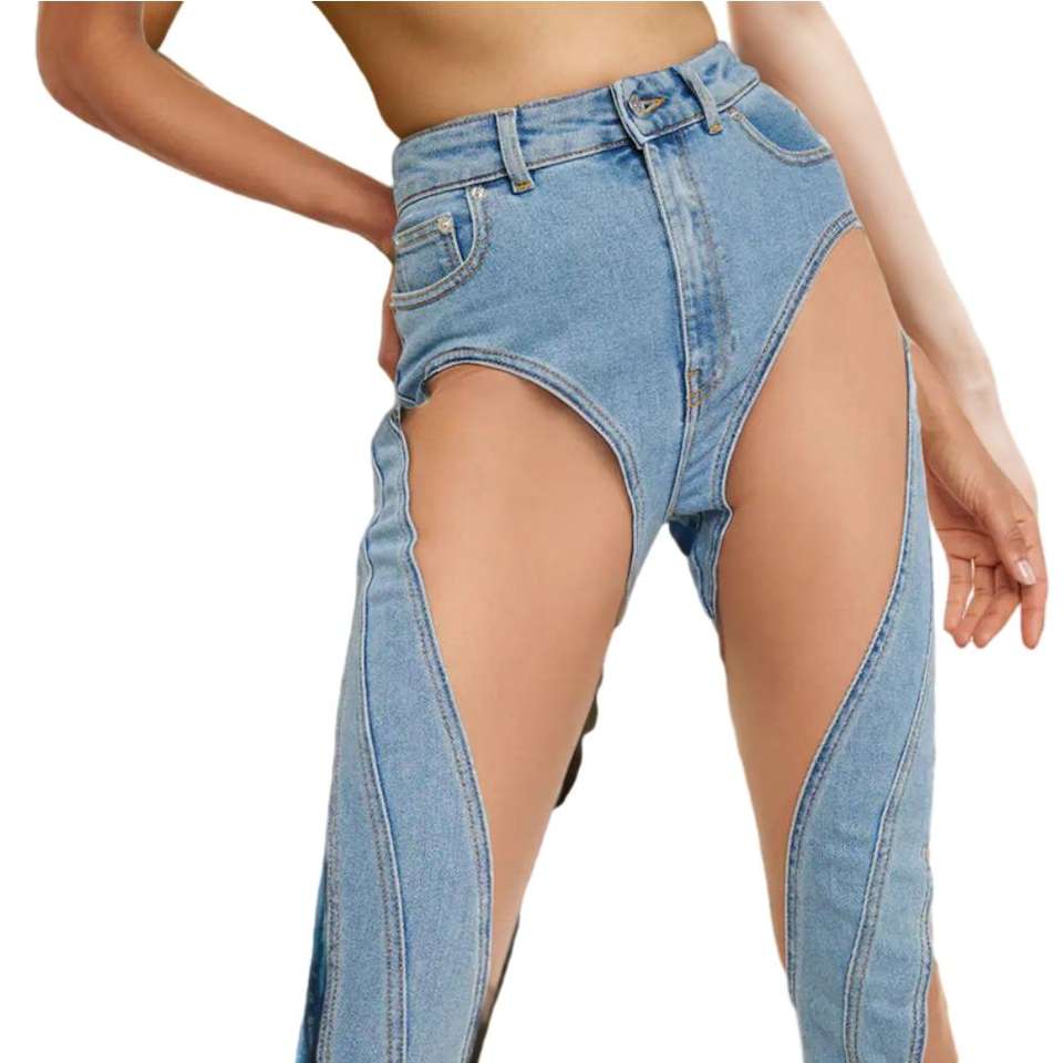 กางเกงยีนส์ทรงตรงกลวงออกกางเกงเซ็กซี่สีทึบ