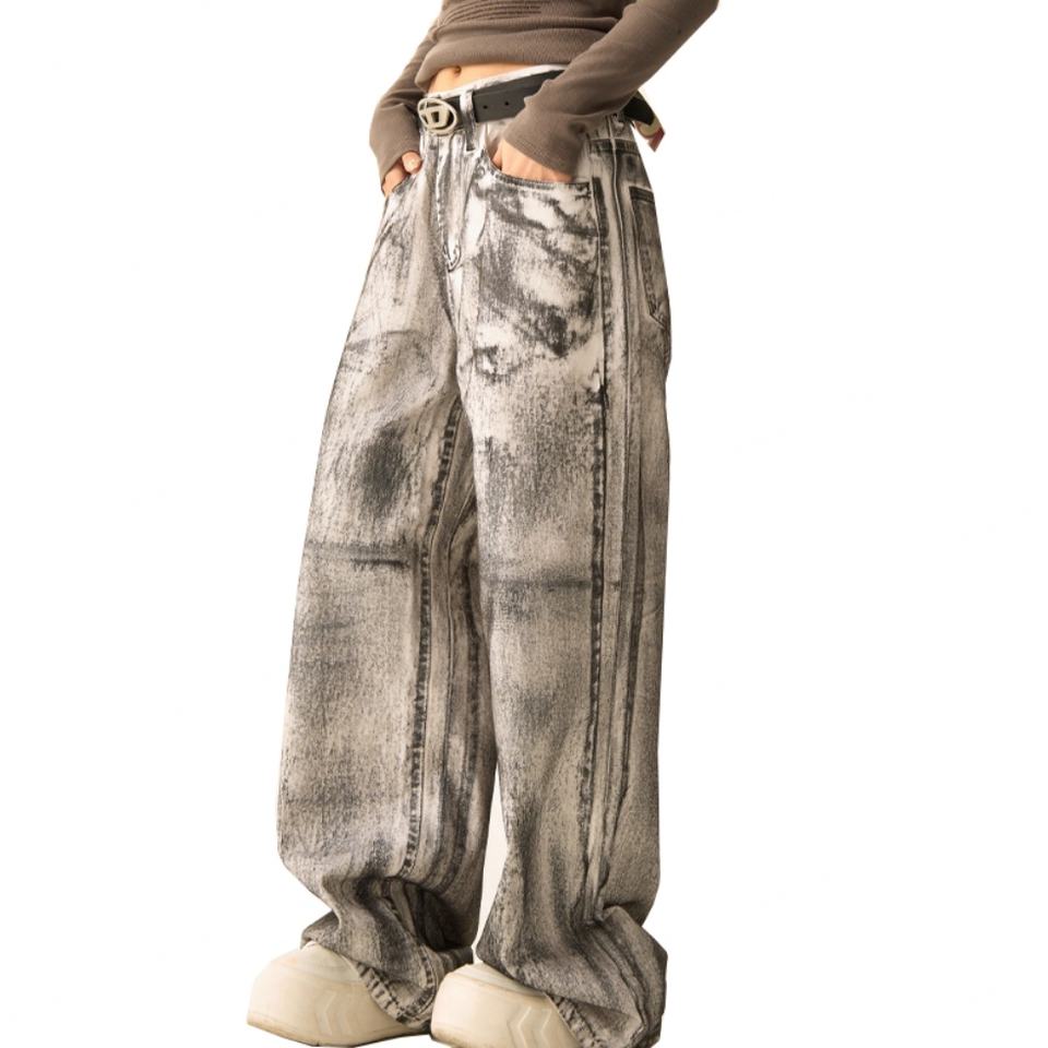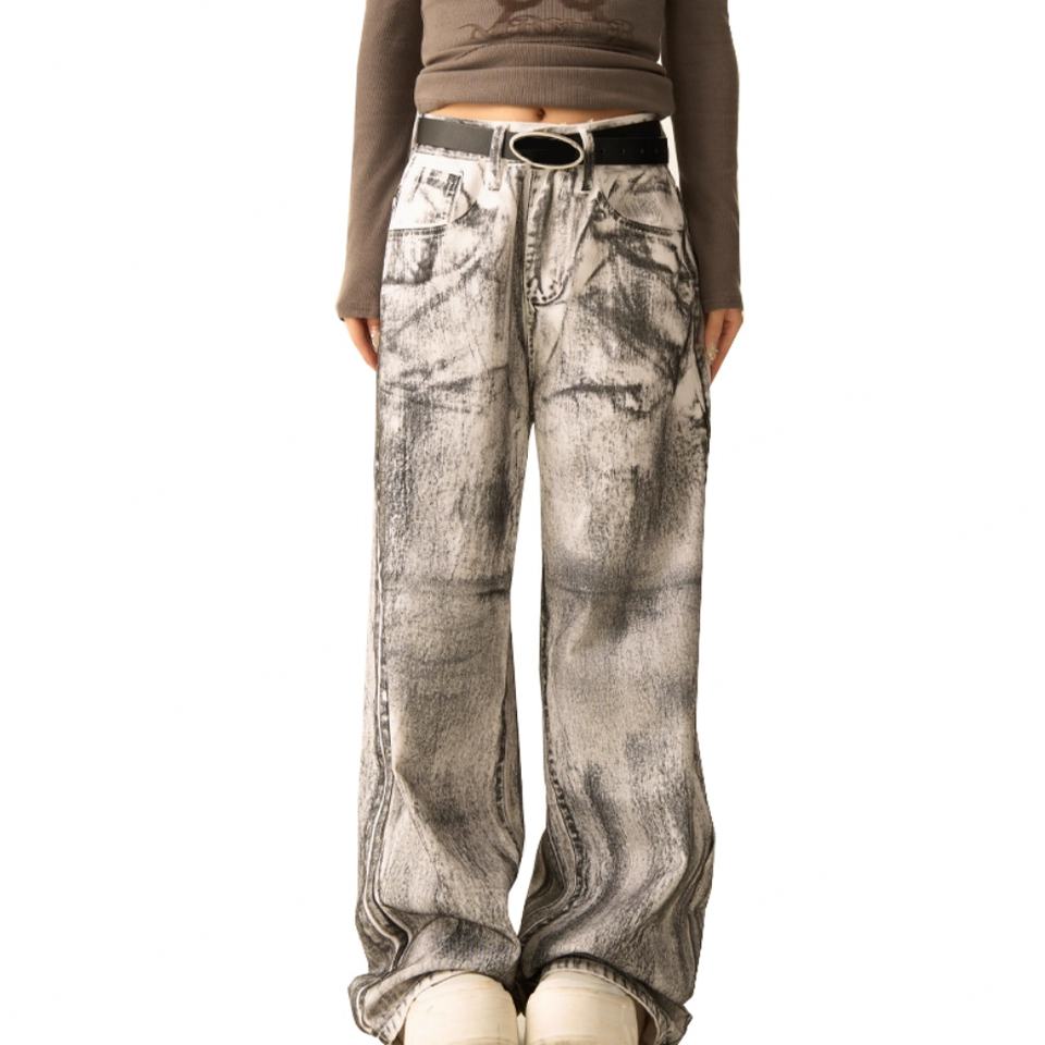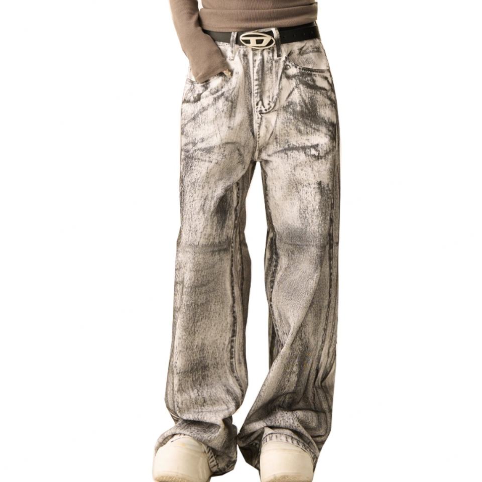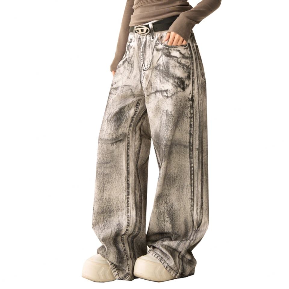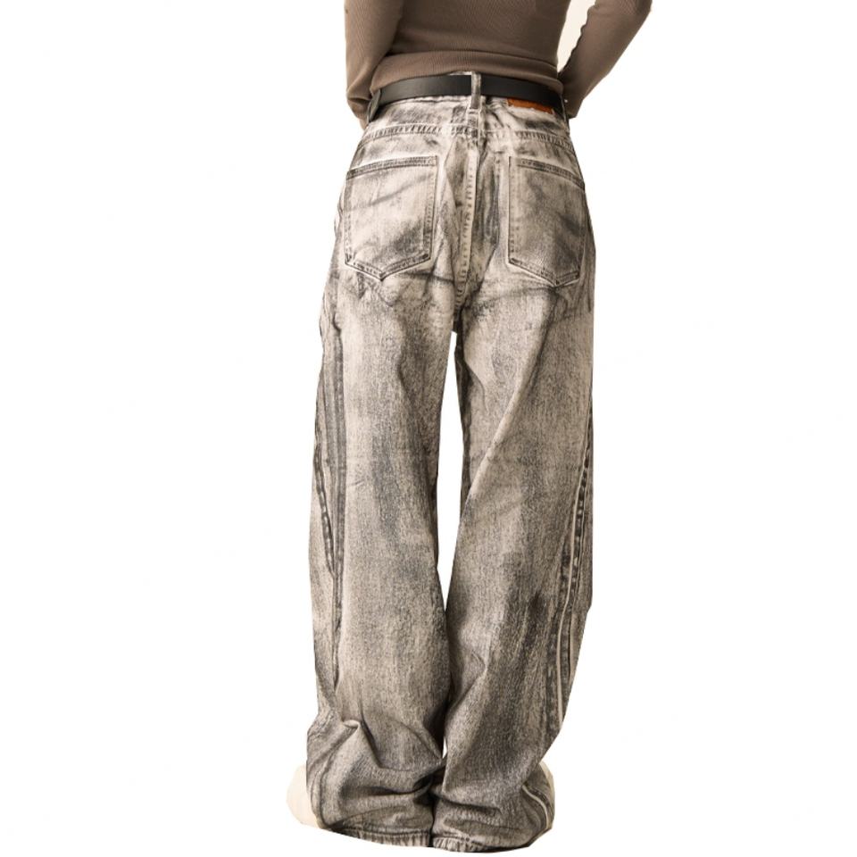 กางเกงยีนส์ผู้ชายทรงหลวมขากว้างสีขาวฟอกย้อมสไตล์วินเทจขายส่ง แฟชั่นลำลองสไตล์ไฮสตรีท