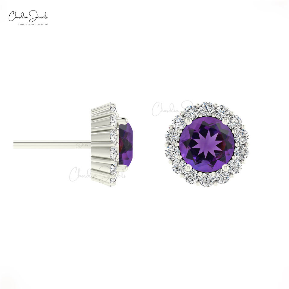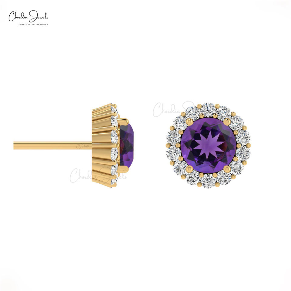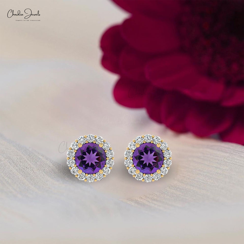 ต่างหูอะมีทิสต์ทรงกลมขนาด 4 มม. แบบขายส่ง พร้อมตัวล็อกแบบกดทำจากทองคำแท้ 14k ประดับเพชร จำนวนมาก