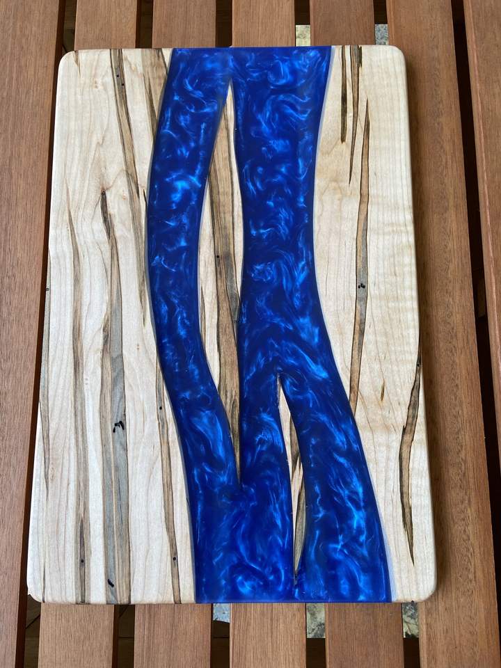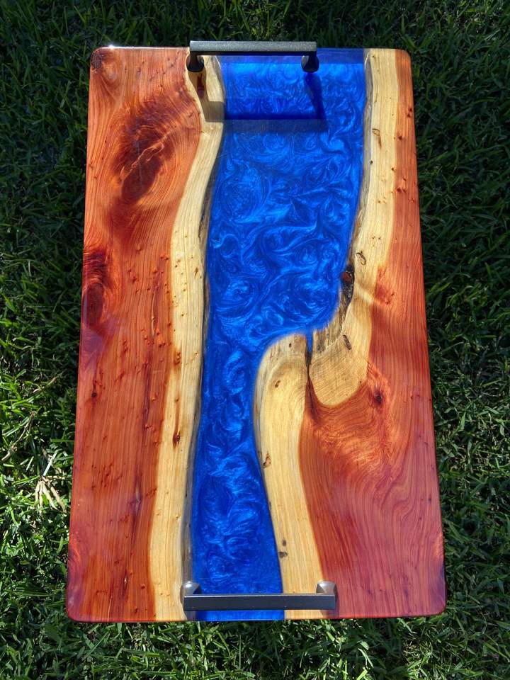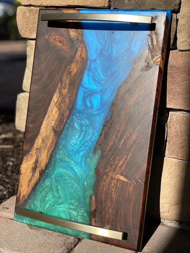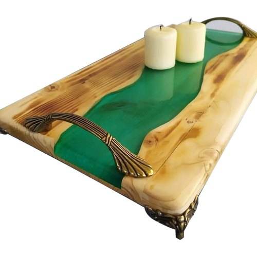 ถาดเสิร์ฟทำเองจากเรซิ่นอีพ็อกซี่และไม้มะม่วงพร้อมหูจับโลหะ สำหรับโรงแรม ร้านอาหาร อุปกรณ์ครัว ถาดวางบนโต๊ะกาแฟ