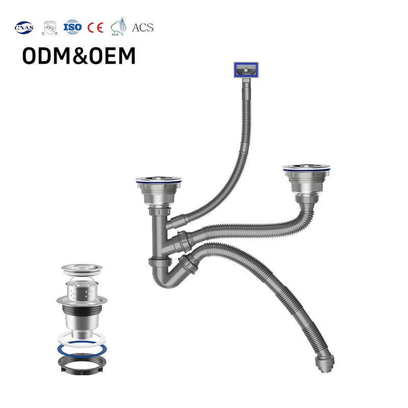 ตัวกรองอ่างล้างจานแบบสองหลุมพร้อมท่ออ่อนทำจากสแตนเลสสำหรับท่อระบายน้ำในครัว (ขายส่ง)