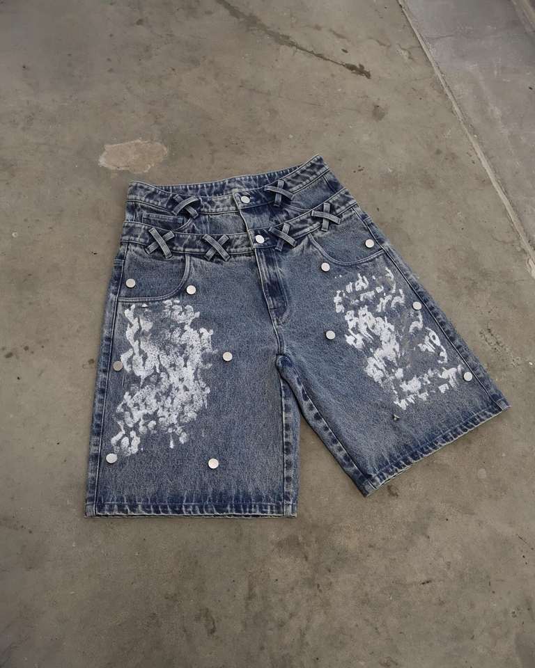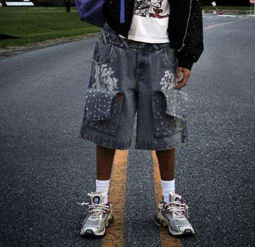 กางเกงยีนส์ขาสั้นทรงคาร์โก้ประดับเพชรที่เข่าและเอวสองชั้นสำหรับผู้ชาย ขายส่ง