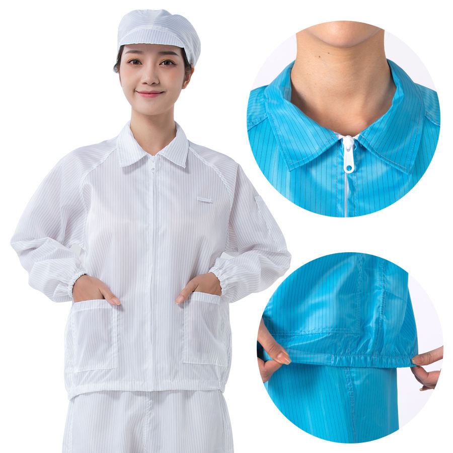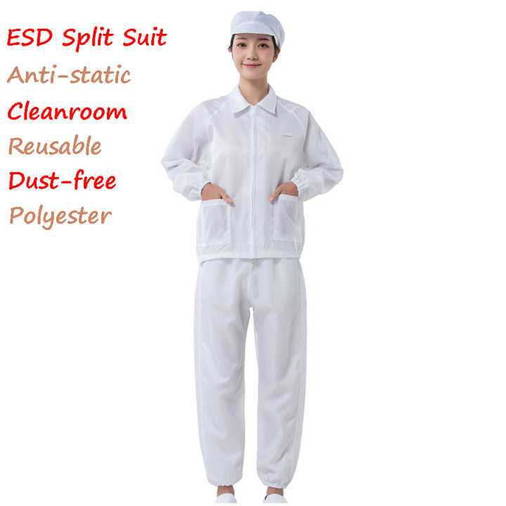ชุดป้องกันไฟฟ้าสถิตย์ ESD สำหรับห้องคลีนรูม เสื้อแจ็คเก็ตและกางเกง ป้องกันฝุ่นและขุยผ้า สำหรับโรงงานอิเล็กทรอนิกส์