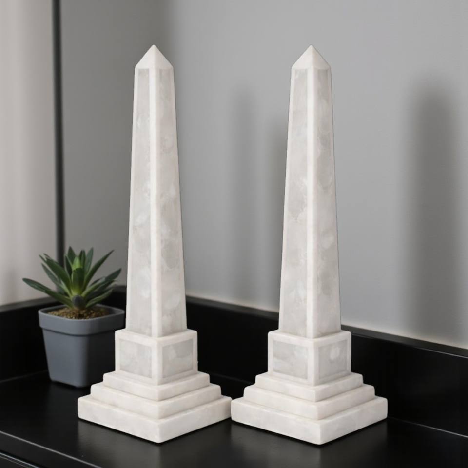หินควอตซ์สีขาวทรงโอเบลิสก์คู่ งานฝีมือ ตกแต่งบ้าน สำนักงาน โต๊ะทำงาน แบบขายส่ง เป็นมิตรกับสิ่งแวดล้อม ทันสมัย