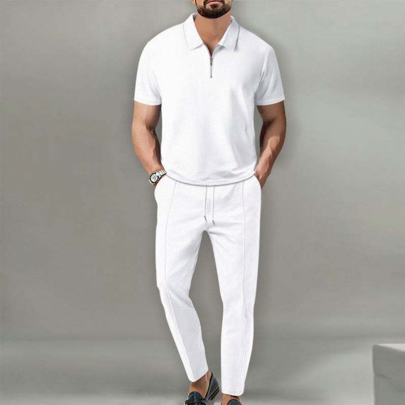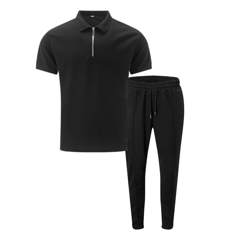 ชุดเซ็ตสองชิ้นแฟชั่นสตรีทแวร์ผู้ชายสไตล์ลำลองผ้าทวิลล์รักษ์โลกขายส่ง สีพื้น คอปก แขนสั้น คอเต่า สำหรับฤดูร้อน