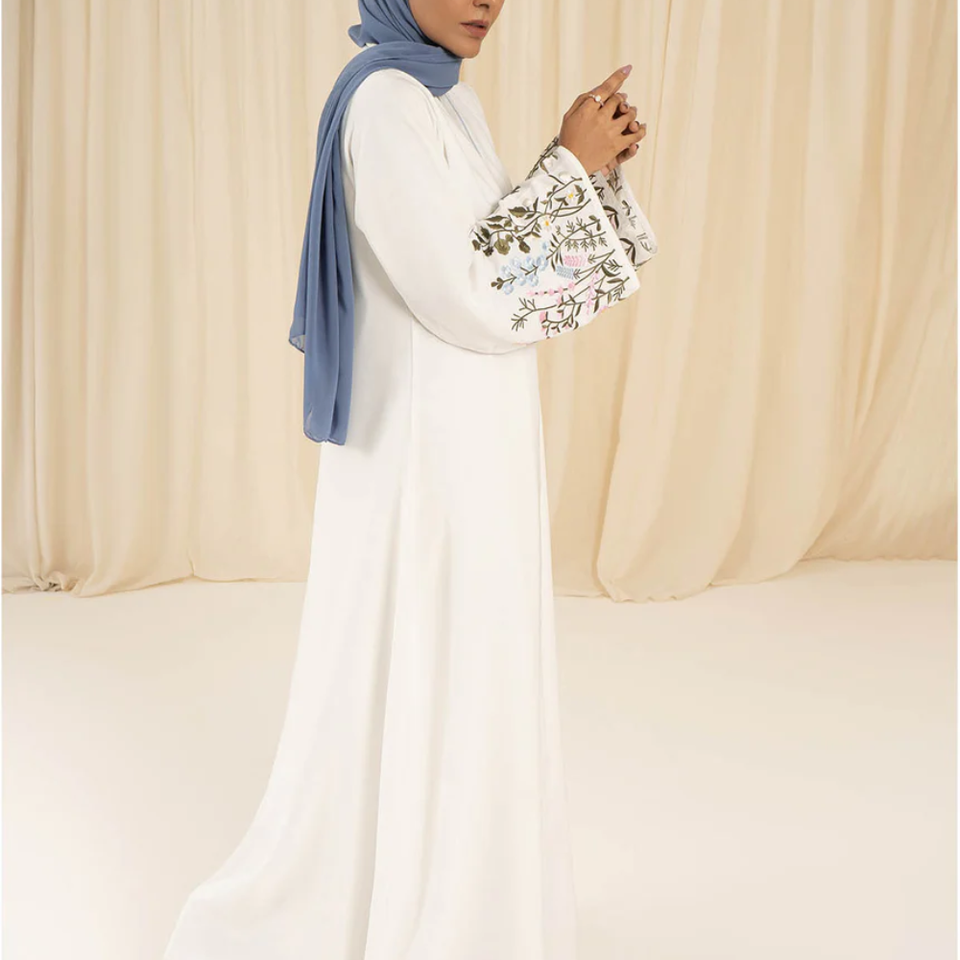 ขายส่งชุดอาบายะห์สีขาวและสีเทาแบบเรียบหรูสไตล์ดูไบ พร้อมลายปักดอกไม้ที่ข้อมือ เสื้อผ้ามุสลิมอิสลามจากตุรกี