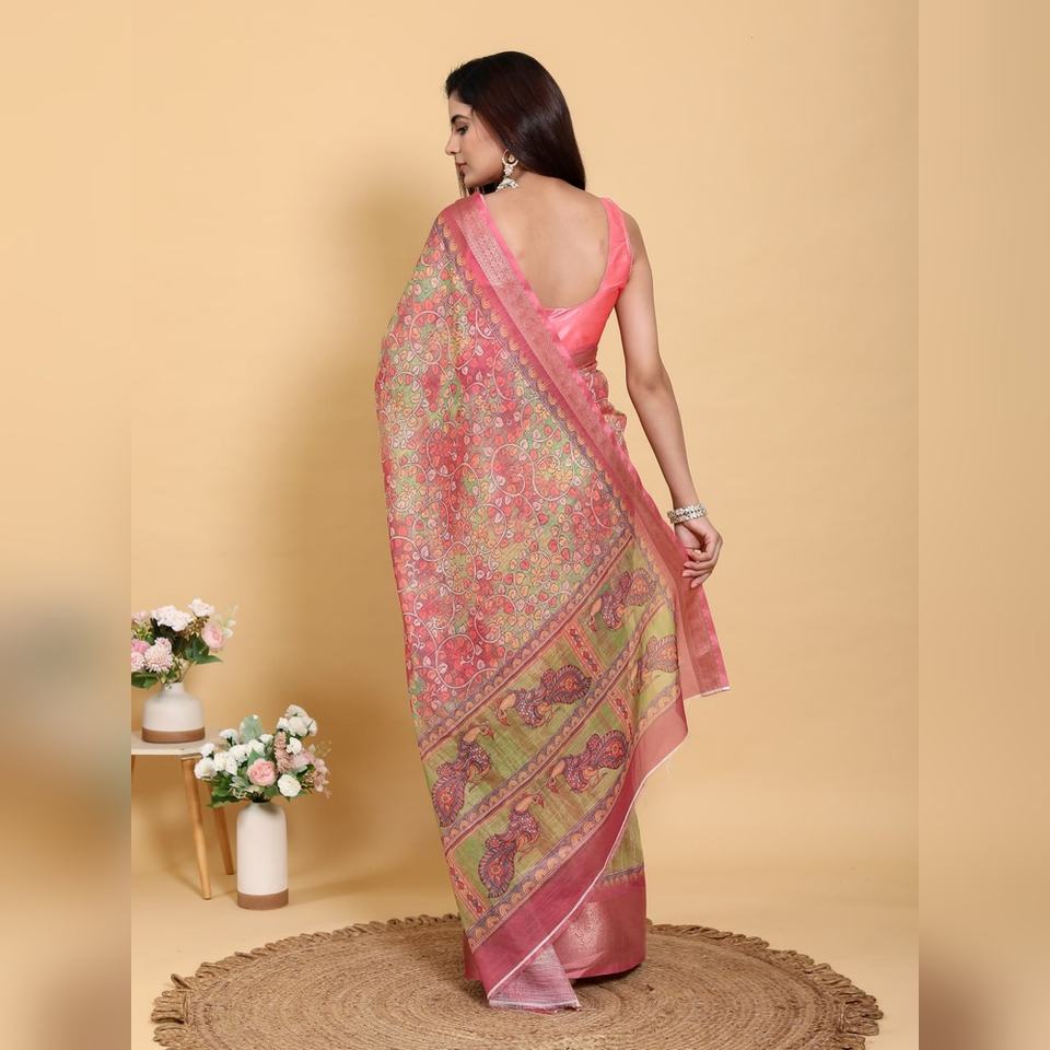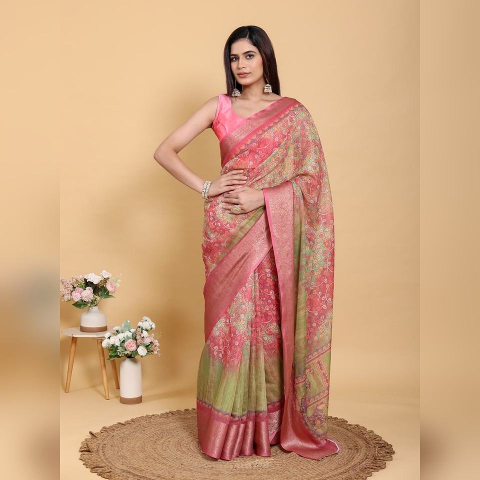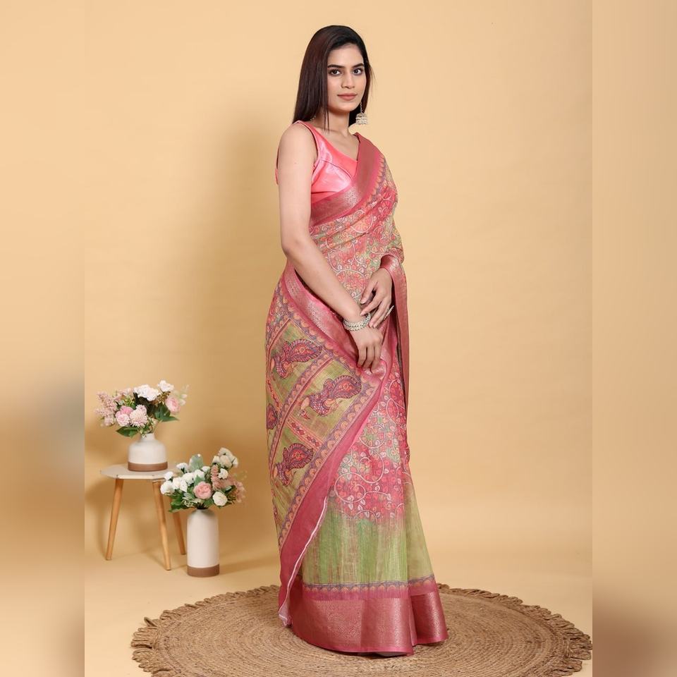 ผ้าซารีผ้าลินินผสมคอตตอนลายแจ็คการ์ดสีชมพูเขียวแบบขายส่ง รุ่น GG-601 น้ำหนักเบา ดีไซน์แบบไม่เย็บสำเร็จ