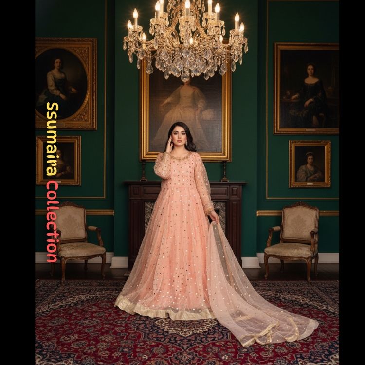 ชุดเดรสอนาร์กาลีงานปาร์ตี้สไตล์เอเชียใต้สีชมพู ประดับกระจก งานปักหนักบริเวณคอ ผ้าไหมแท้ แต่งเลื่อม ขายส่ง