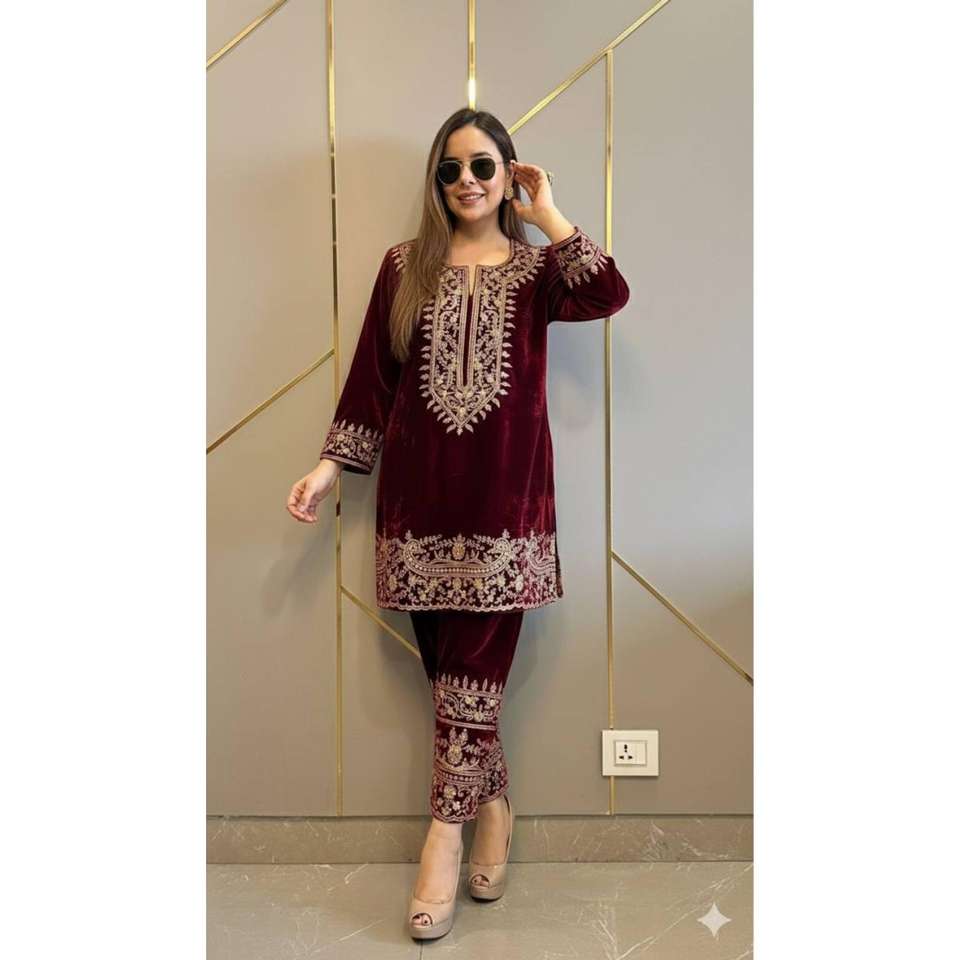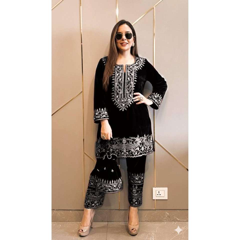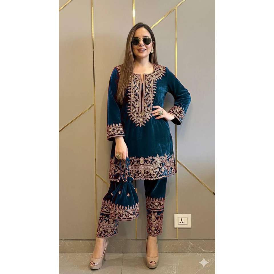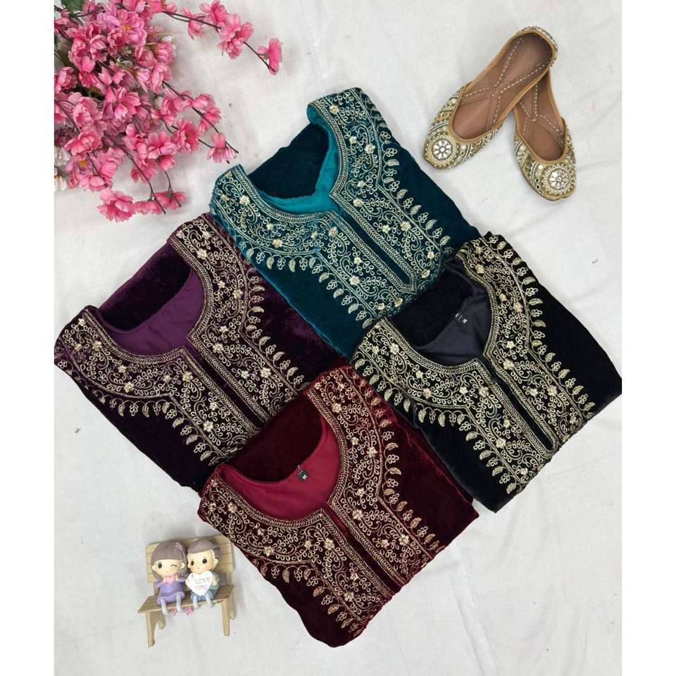 ชุดสัลวาร์คามีซกำมะหยี่สำหรับผู้หญิง ดีไซน์หรูหรา ปักลายบริเวณคอเสื้อด้วยดิ้นทอง งานปักประณีต ความยาวระดับเข่า ใส่ได้ทุกฤดู แห้งเร็ว ขายส่ง