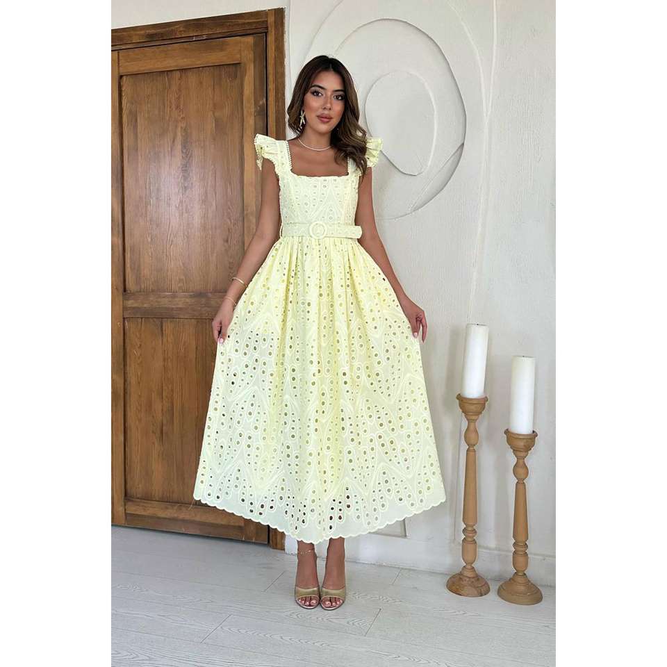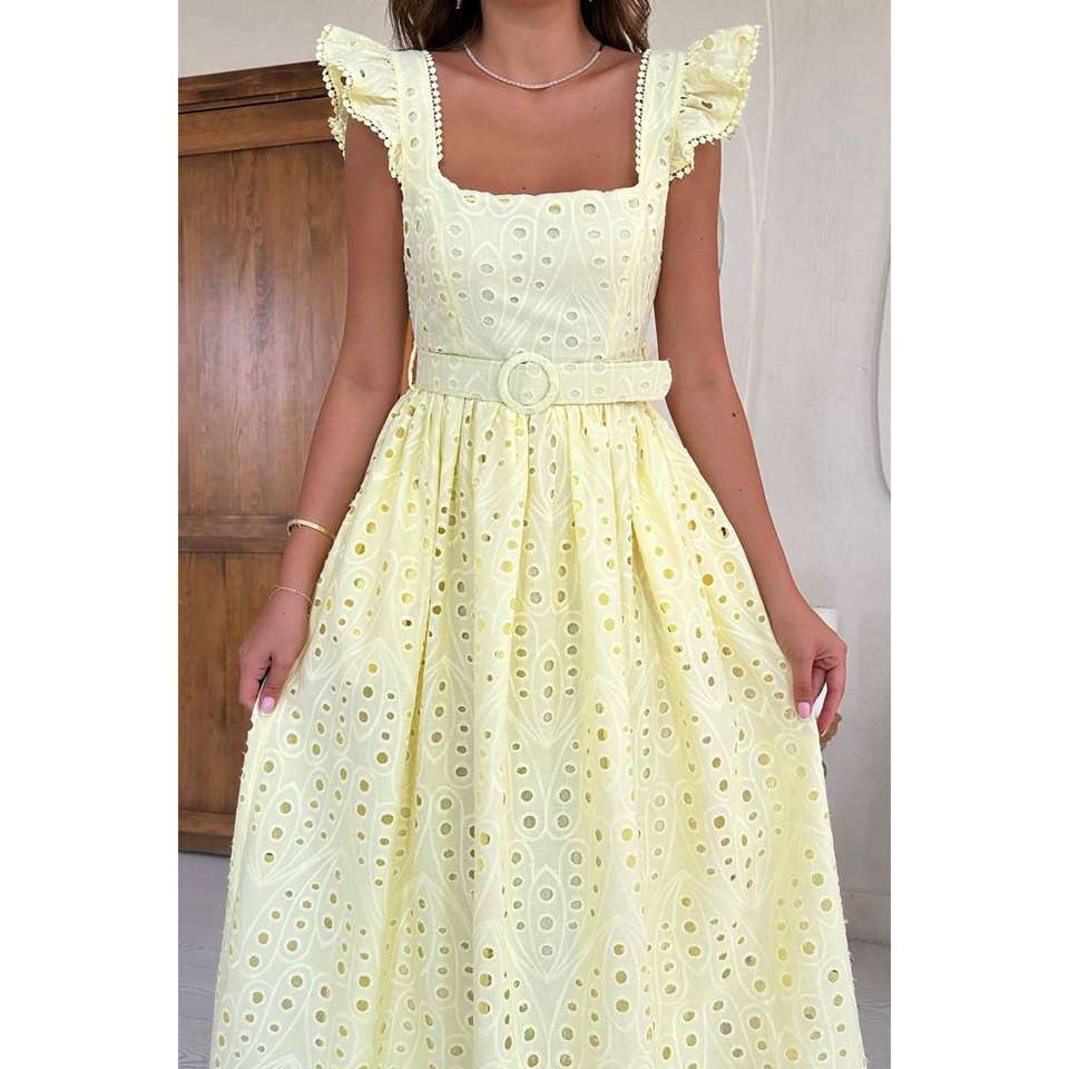ชุดเดรสยาวสีเหลืองหรูหรา ปักลายลูกไม้ แต่งเพชร ซิป XL ผ้าโปร่งแสง ผ่าข้าง เหมาะสำหรับวันหยุด