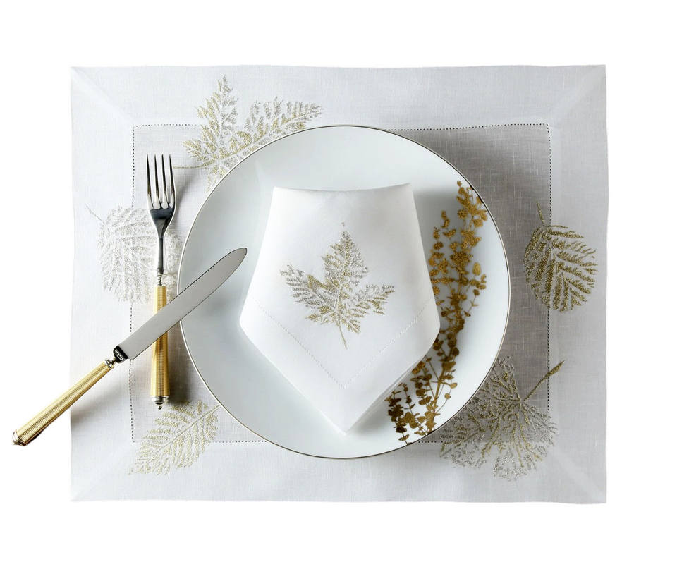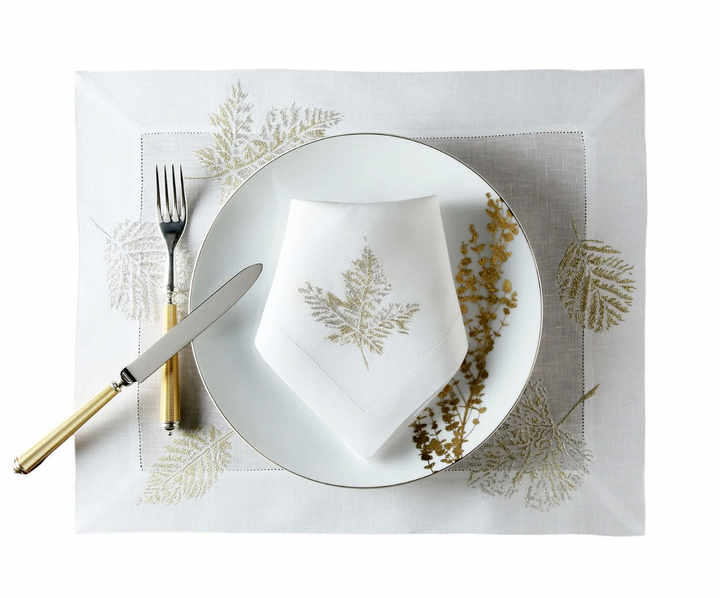 ชุดผ้าเช็ดปากผ้าฝ้ายสีขาวปักลายใบไม้สีทองสำหรับบ้านร้านอาหาร