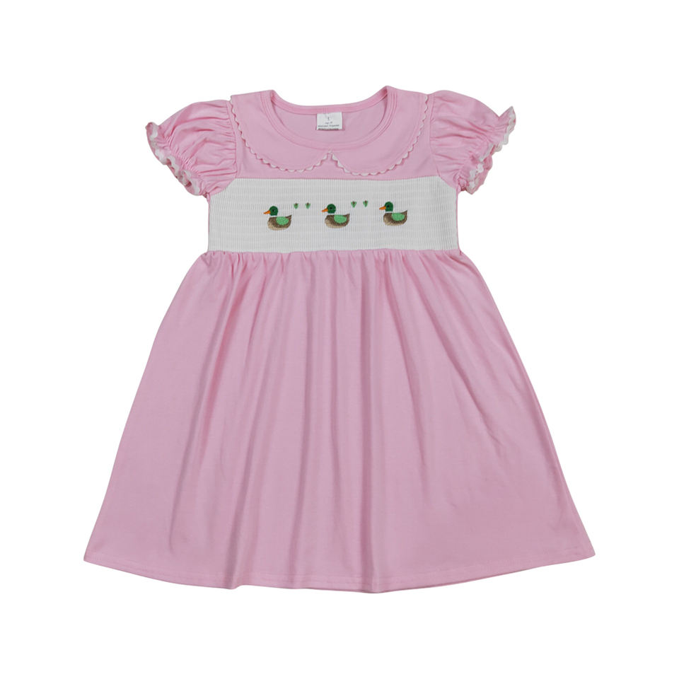 ชุดเดรสแฟชั่นแขนสั้นลายเป็ดเป็ดน้ำสีฟ้าปักสำหรับเด็กผู้หญิงชุดใส่กลางวันสำหรับเด็กวัยหัดเดินเสื้อผ้าบูติก