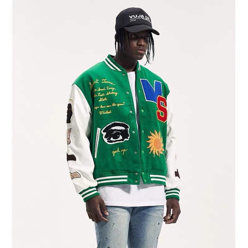 เสื้อแจ็คเก็ตวาร์ซิตี้แบบมีแขนหนังสีเขียวปักลายขายส่งสำหรับผู้ชาย