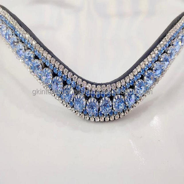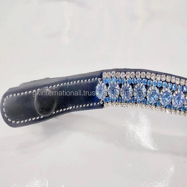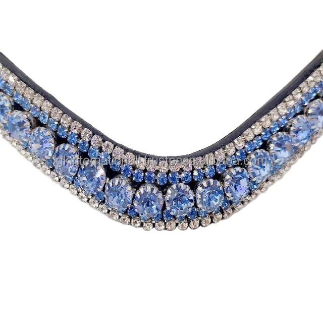 สายคาดหน้าผากม้าหนังวัวแท้สีดำ ผลิตภัณฑ์สำหรับม้าขายส่ง ตกแต่งด้วยคริสตัลสีฟ้าอ่อนหรูหรา 5 แถว พร้อมสายโซ่ประดับ