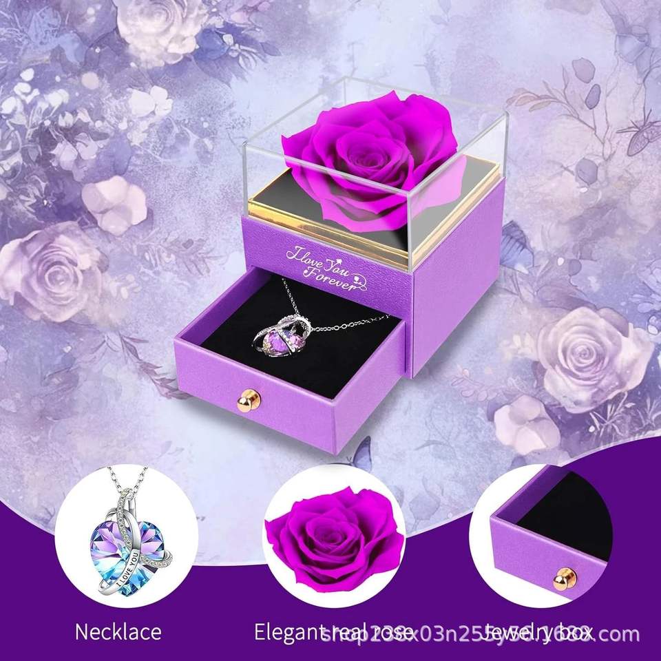 กล่องเครื่องประดับกระดาษ/กระดาษแข็งรูปทรงสี่เหลี่ยมผืนผ้า พร้อมสร้อยคอและแหวน สำหรับวันแม่ ดอกกุหลาบนิรันดร์และดอกไม้จริง 100 ภาษา ขายส่ง