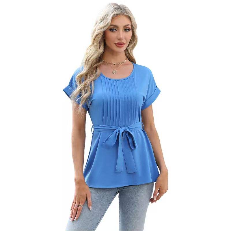 เสื้อยืดผู้หญิงสไตล์ยุโรปอเมริกัน สีพื้น ผ้าโพลีเอสเตอร์ ระบายอากาศดี มีเชือกผูกเอว คอทรงกลม แขนสั้น ขายส่ง