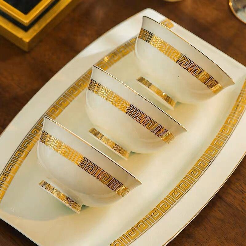 ชุดอาหารค่ำสไตล์ยุโรปสีทอง 60 ชิ้น ทำจากกระดูกจีน และชุดจานพอร์ซเลน ขายส่ง