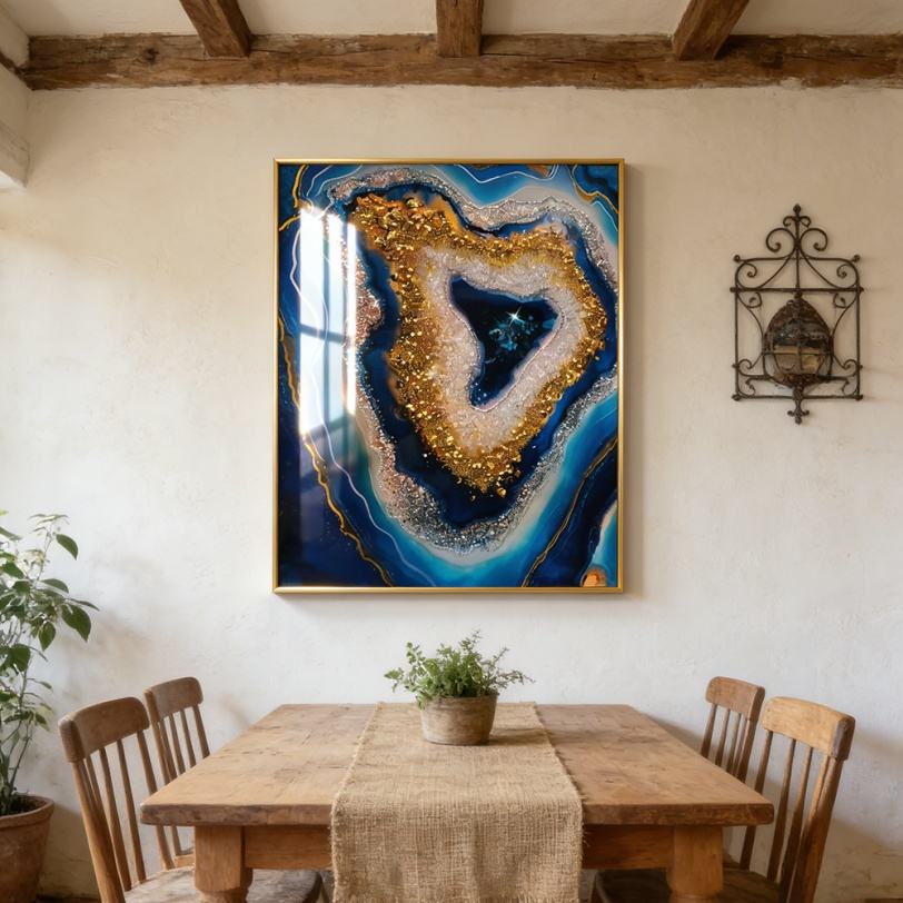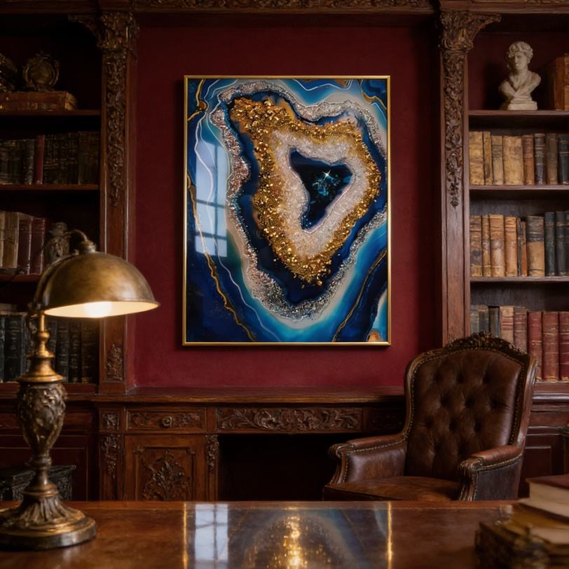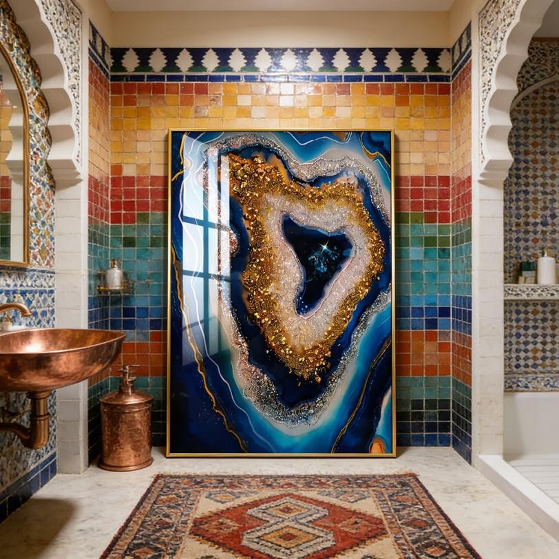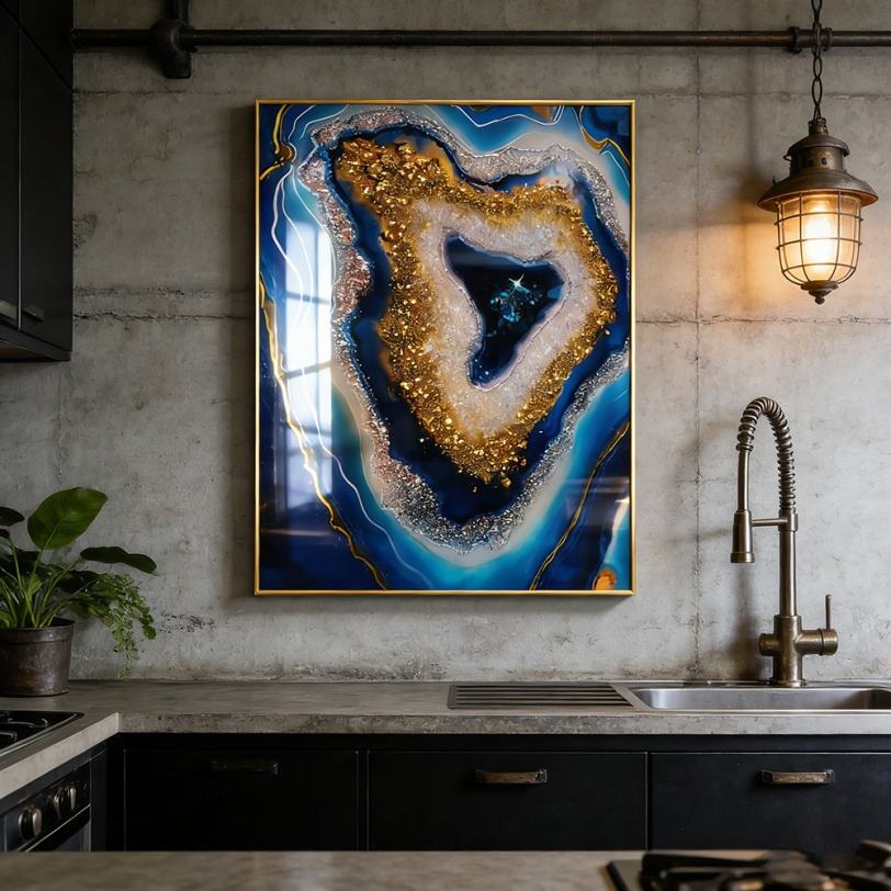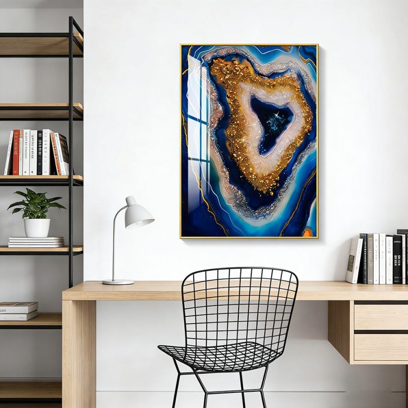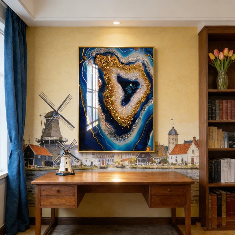 ภาพตกแต่งผนังบ้านขนาดใหญ่พิเศษแบบนามธรรมพร้อมไฟ LED ภาพวาดลายคริสตัลพอร์ซเลนสีน้ำเงินในกรอบ
