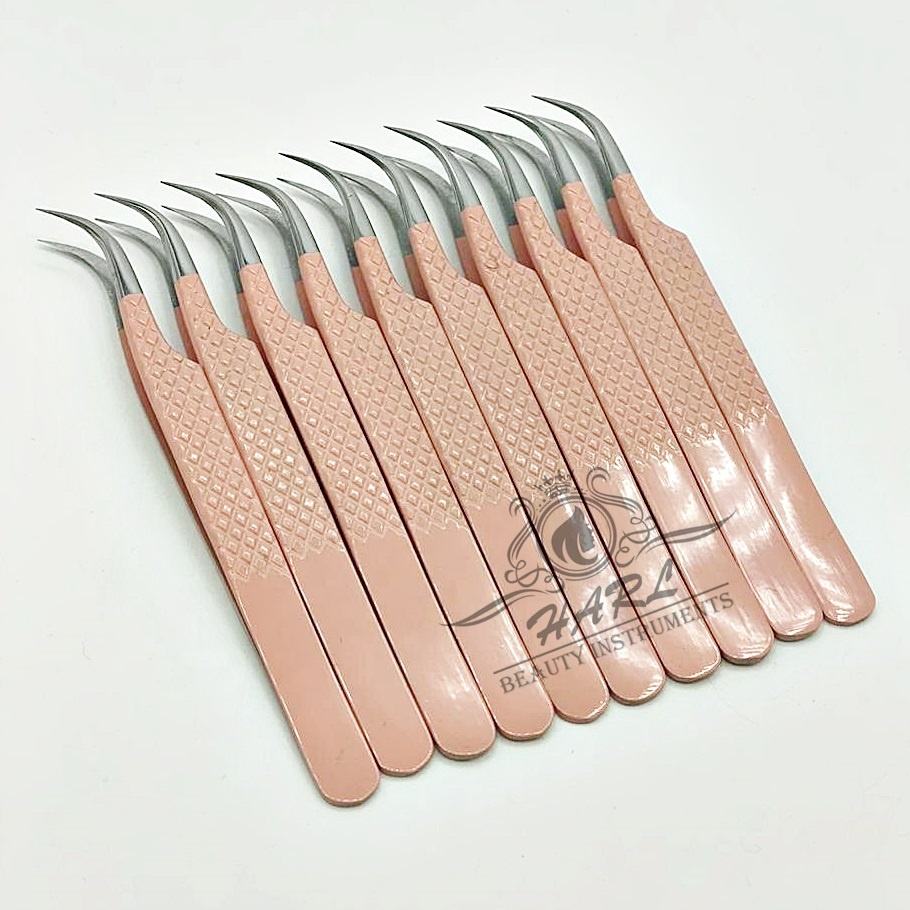 Wholesale Professional Eyelash Extension Tweezers Stainless Steel Peach Colour Curved Shape Volume Private Label Fiber Tip
