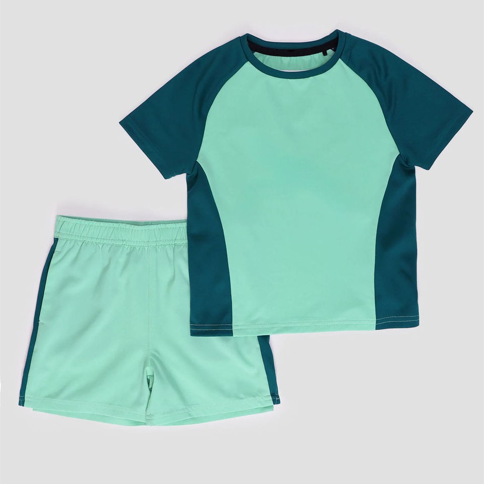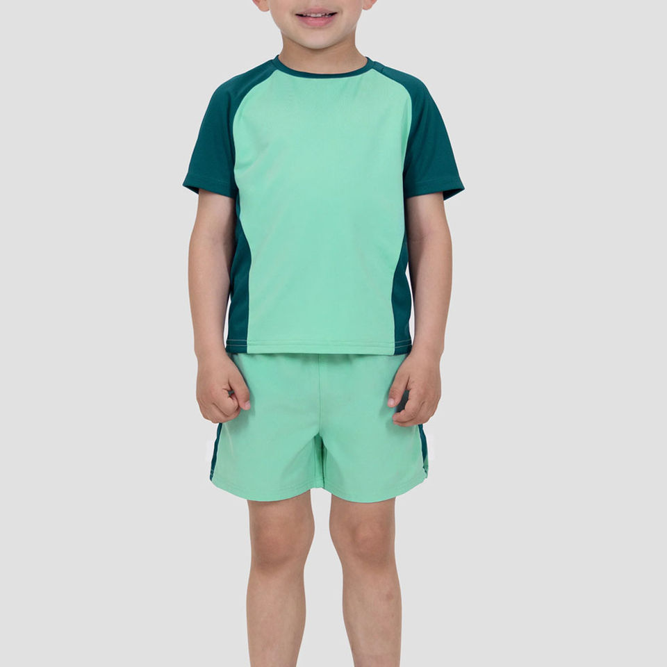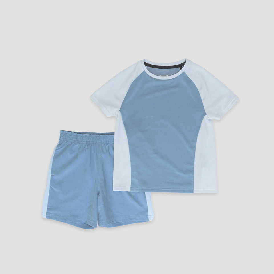 ชุดเสื้อยืดและกางเกงขาสั้นเด็กผู้ชาย 2 ชิ้น ผ้าเนื้อเบา ระบายอากาศ ป้องกันแบคทีเรีย ตัดเย็บด้วยผ้าตัดต่อสี ผลิตจากโรงงาน รับผลิตตามแบบ