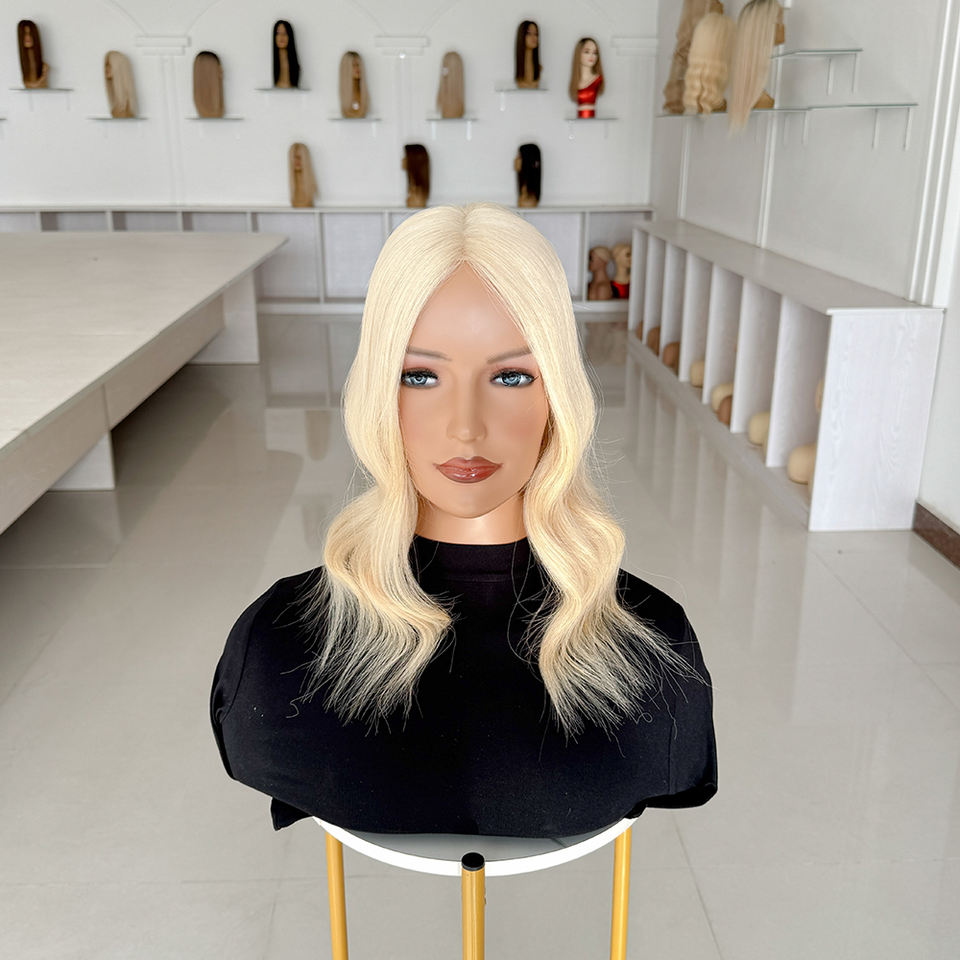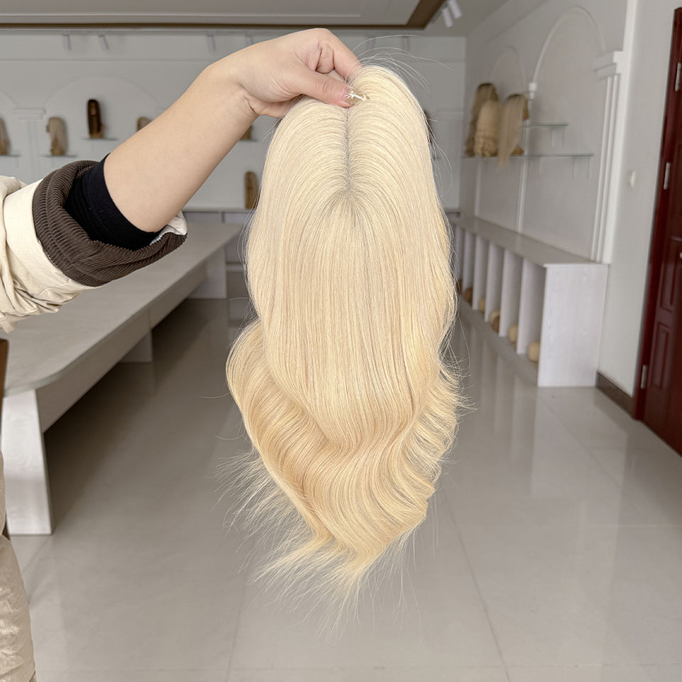 โรงงานขายส่ง ท็อปเปอร์ผมแท้คุณภาพสูง ทนทาน ระบายอากาศได้ดี สีบลอนด์ ลอนคลื่น ขนาด 14-18 นิ้ว 5*6 โมโนท็อปเปอร์ # 60 สี