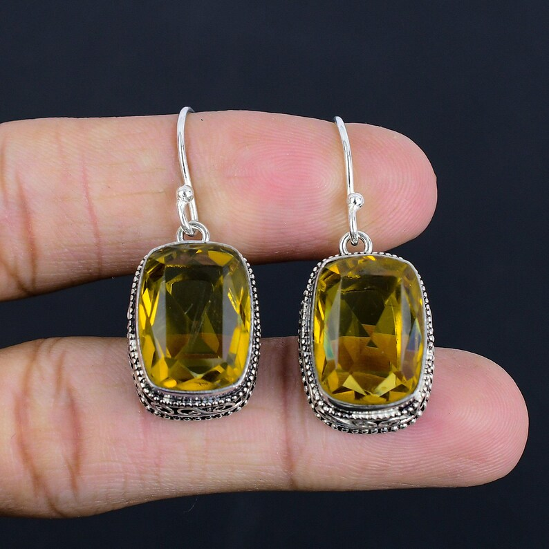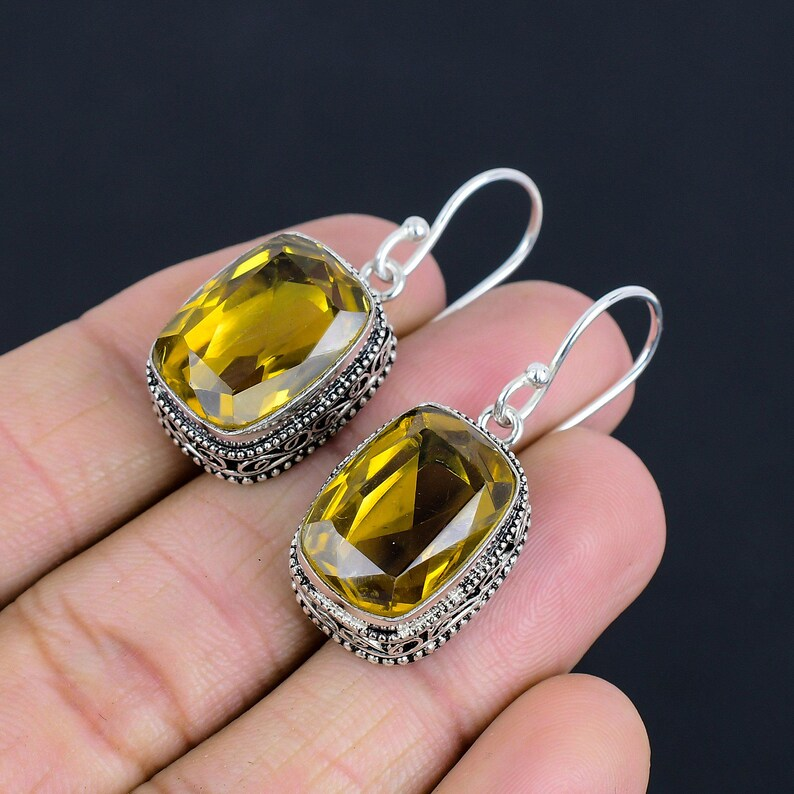 ต่างหูแบบห้อยทำมือตะขออัญมณีเหลี่ยมเพชรพลอยซิทรินสีเงิน925สำหรับเป็นของขวัญ