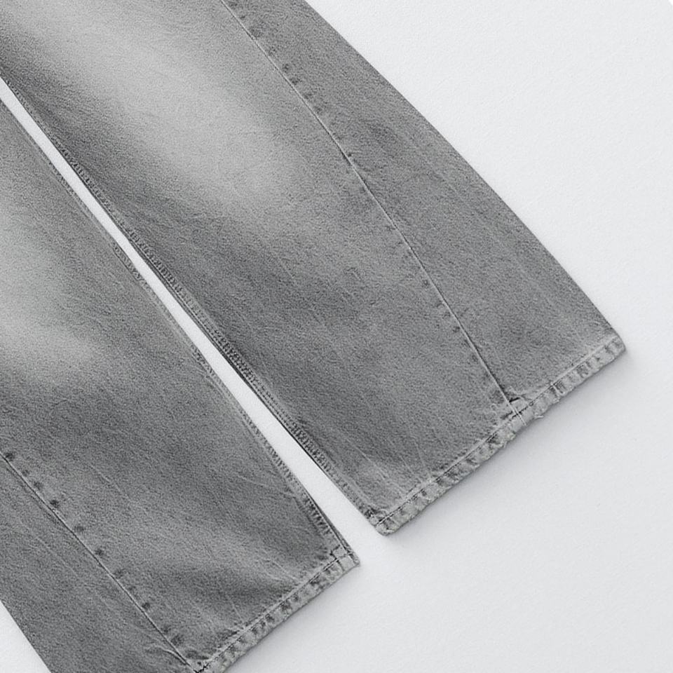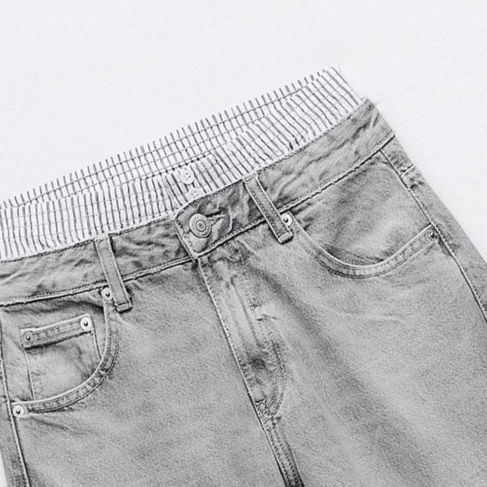 กางเกงยีนส์ผู้ชายเอวต่ำทรงบ็อกเซอร์ขาบานฟอกสีแบบดิสเทรส ราคาโรงงานขายส่ง รับผลิตตามแบบ OEM