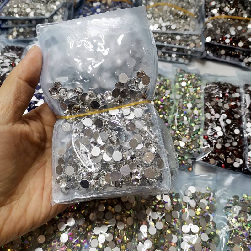 คริสตัลแบบแบนราบสำหรับตกแต่งเสื้อผ้าทำจาก SS3-SS20แวววาวทำจากแก้วพลอยเทียมแบบไม่ผ่านความร้อนขายส่งจำนวนมาก