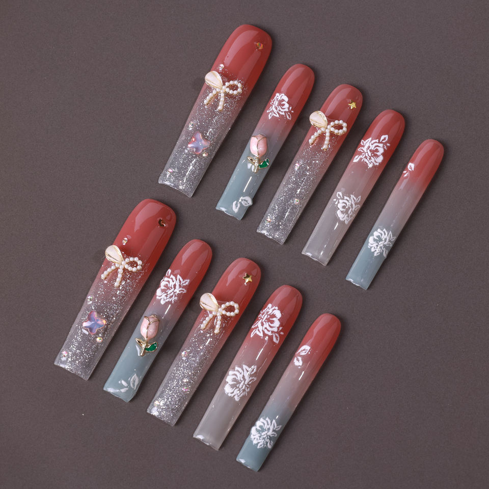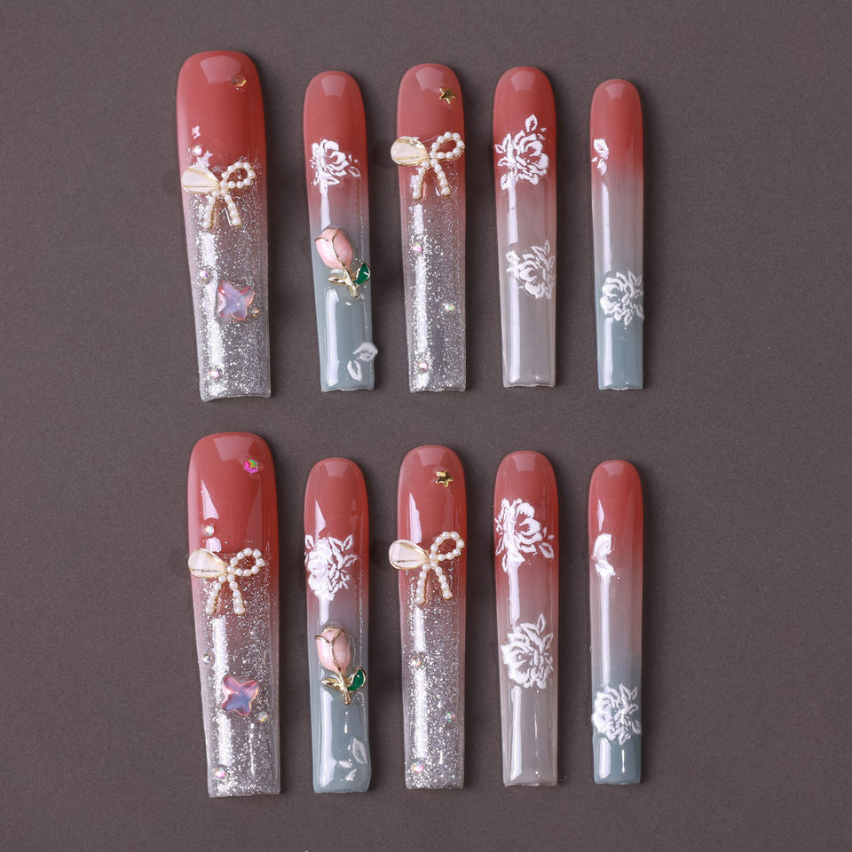 ราคาโรงงานขายส่ง เล็บปลอมอะคริลิกทำมือสุดหรู ประดับเพชรทรงสี่เหลี่ยม แบบ 3 มิติ ปิดเต็มเล็บ ลายเฟรนช์ทิปส์