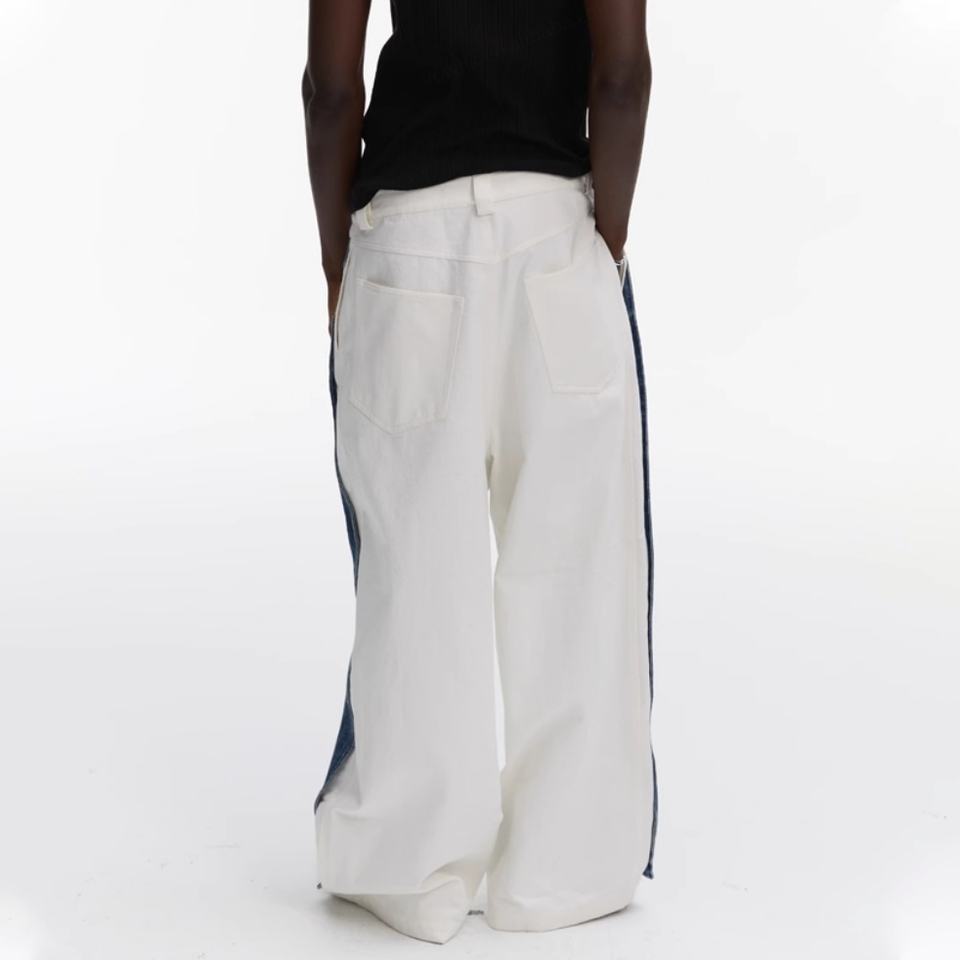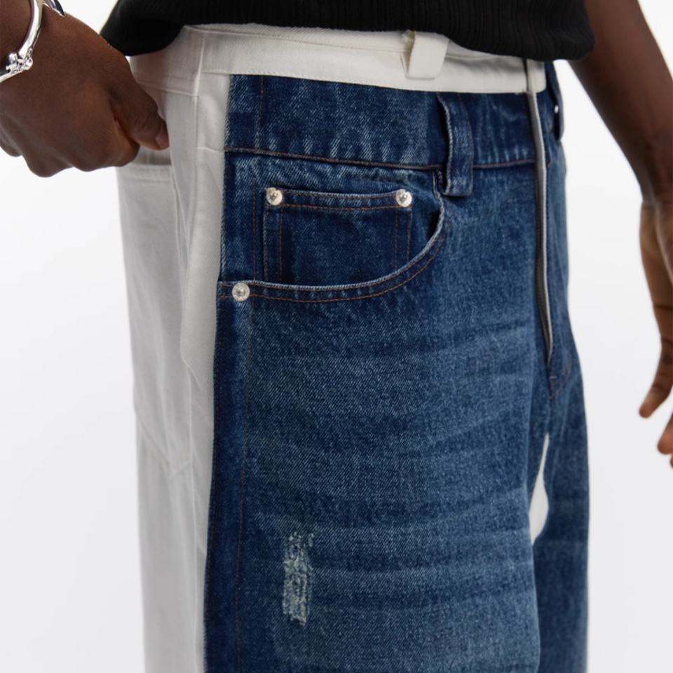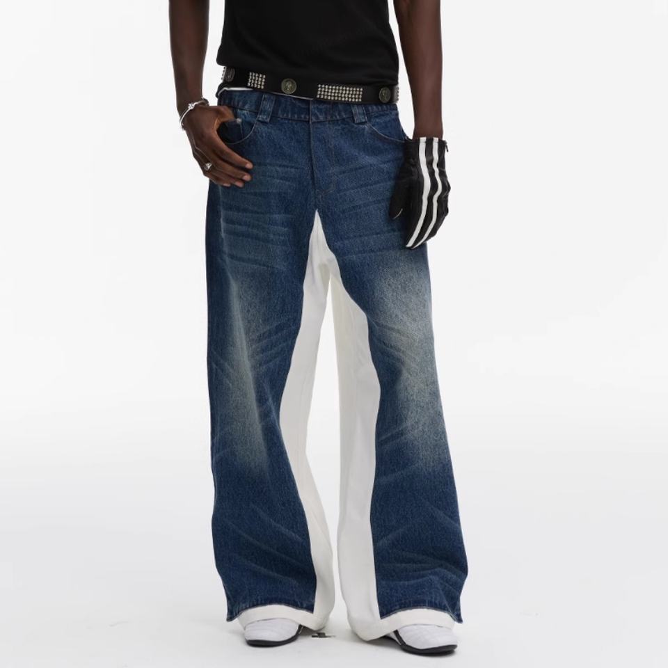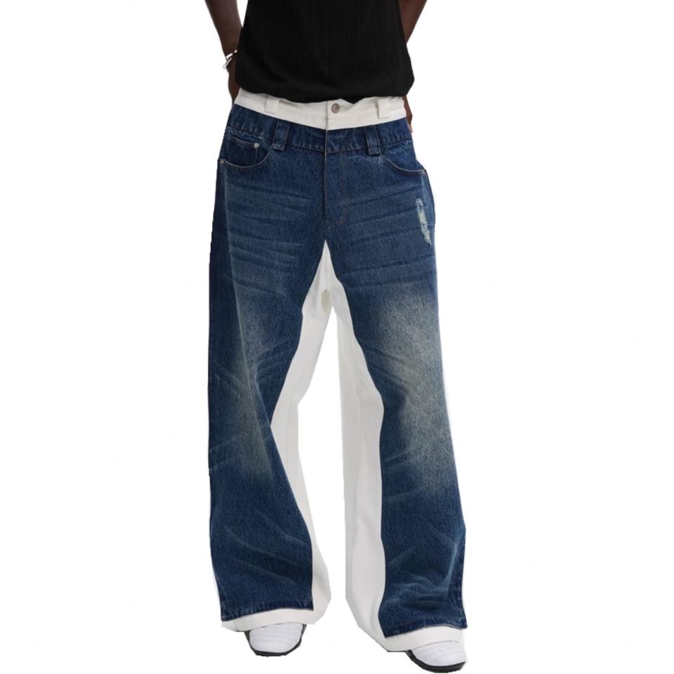 กางเกงยีนส์เดนิมเนื้อหนาคุณภาพสูงแบบขายส่ง ล้างสีซีดจาง ปักโลโก้ตามสั่ง ตะเข็บสีน้ำเงิน ยีนส์สีขาว ทรงหลวม แบบสองชั้น