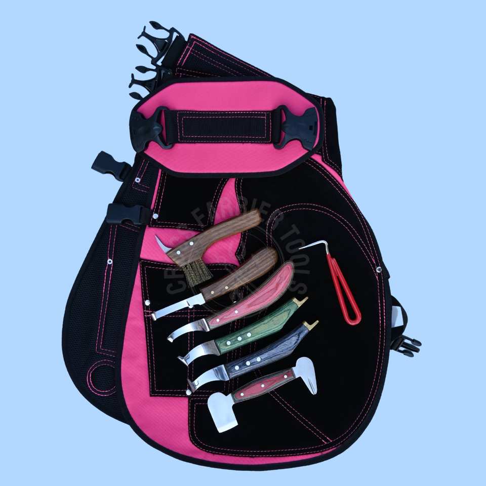 ชุดเครื่องมือช่างตัดแต่งกีบม้าพร้อมผ้ากันเปื้อนหนังนิรภัยสำหรับขายส่ง ประกอบด้วยมีดตัดกีบปลายทองเหลือง มีดตัดแต่งกีบ ที่ตัดกีบ แปรงขัด และแปรงปัด