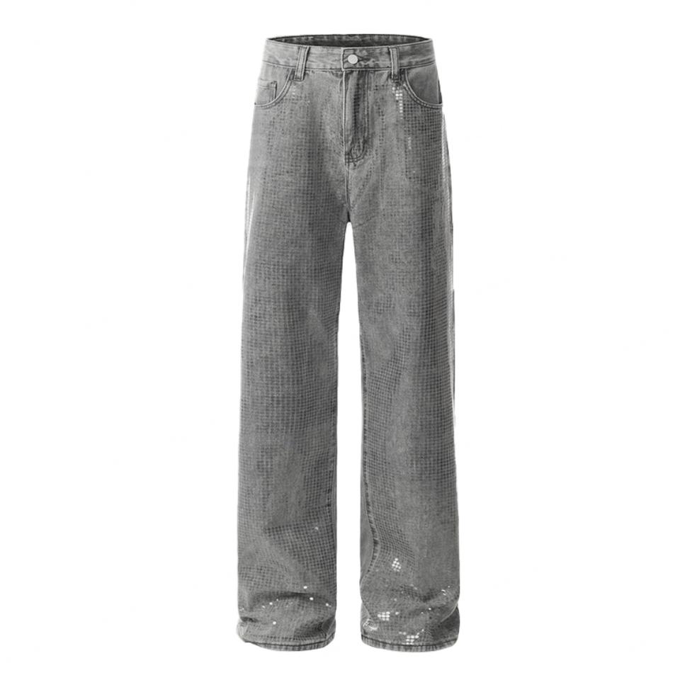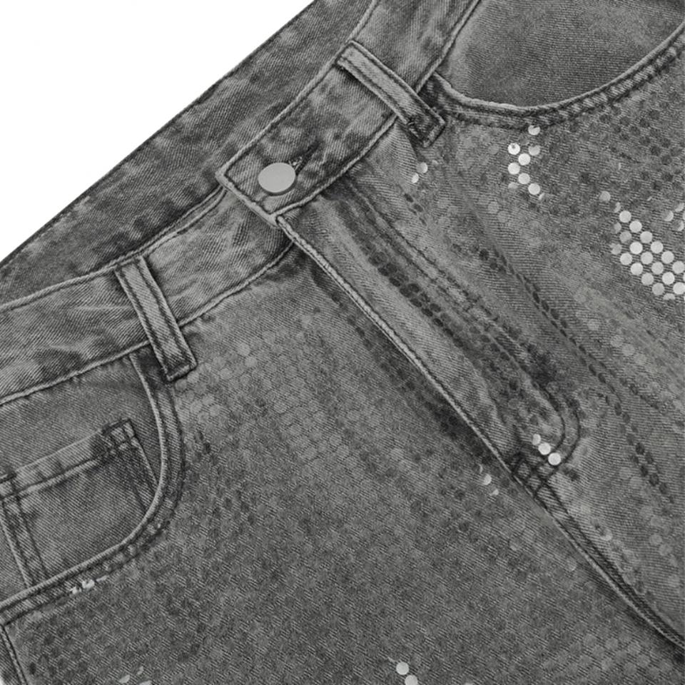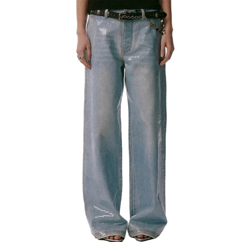 กางเกงยีนส์แฟชั่นขายส่งเอวสูงทรงหลวมสไตล์วินเทจสีน้ำเงินฟอกสำหรับผู้หญิง ตกแต่งด้วยเลื่อม