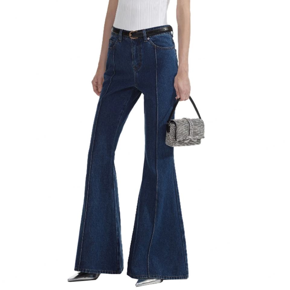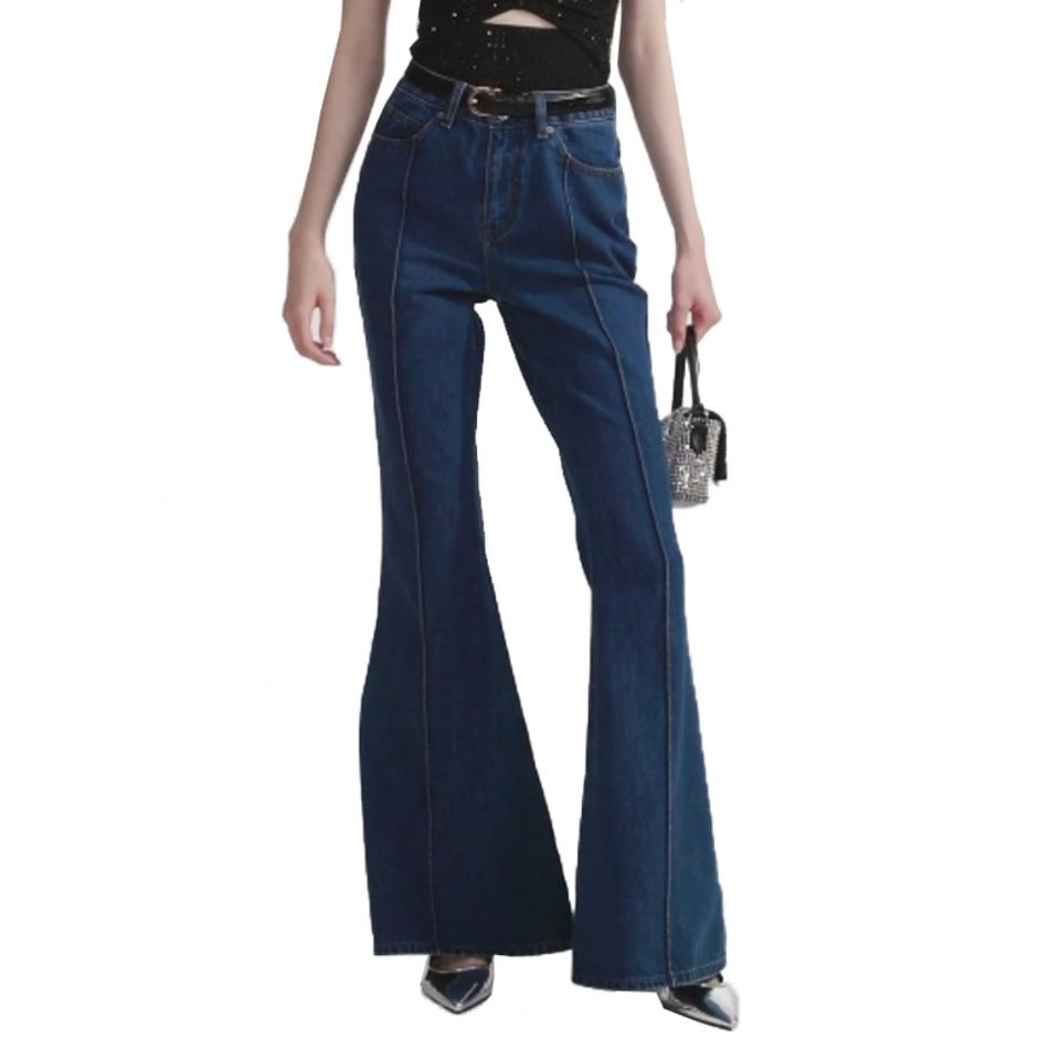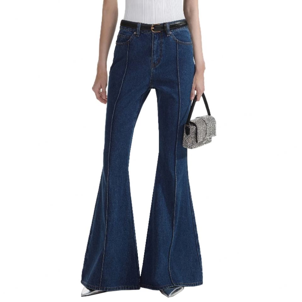 กางเกงยีนส์แฟชั่นขายส่งเอวสูงทรงลำลองสำหรับผู้หญิง สีน้ำเงินวินเทจ ทรงเข้ารูป กางเกงยีนส์ขาบานสำหรับผู้หญิง