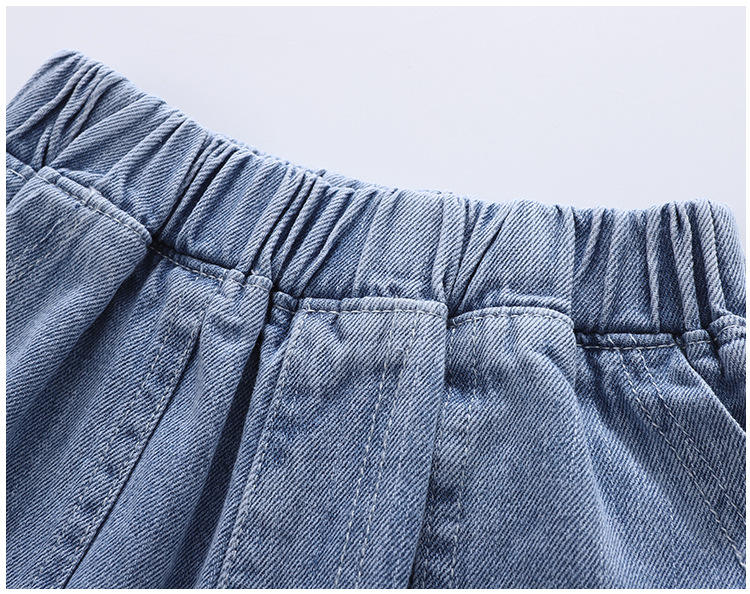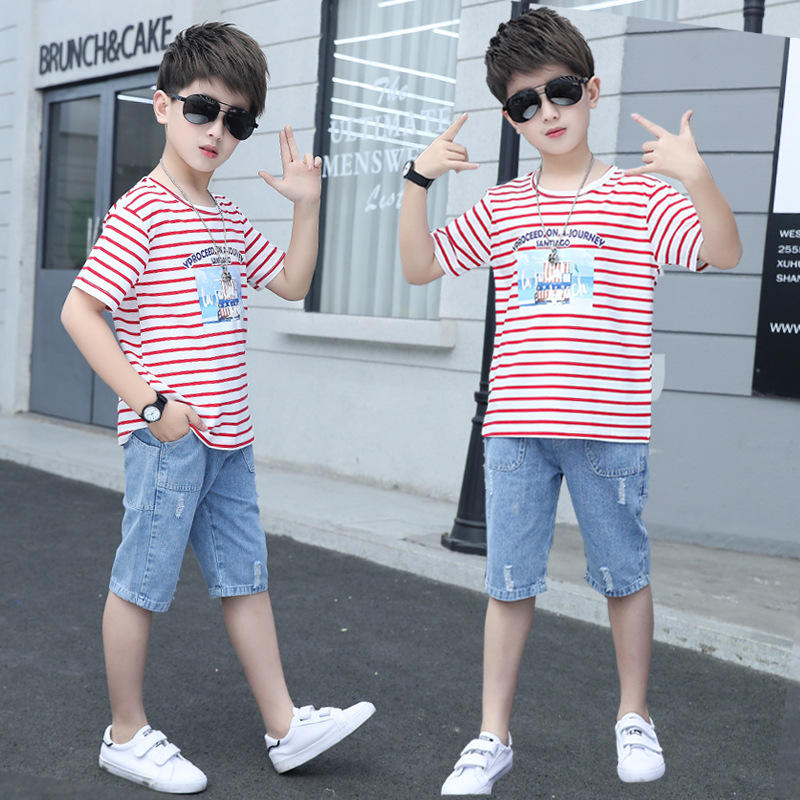 ชุดเสื้อผ้าเด็กผู้ชายแฟชั่นขายส่ง สไตล์หล่อเท่ กางเกงยีนส์สีน้ำเงิน พร้อมเสื้อเชิ้ตมีแถบ