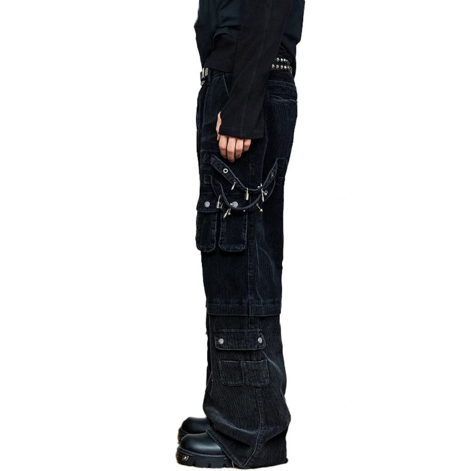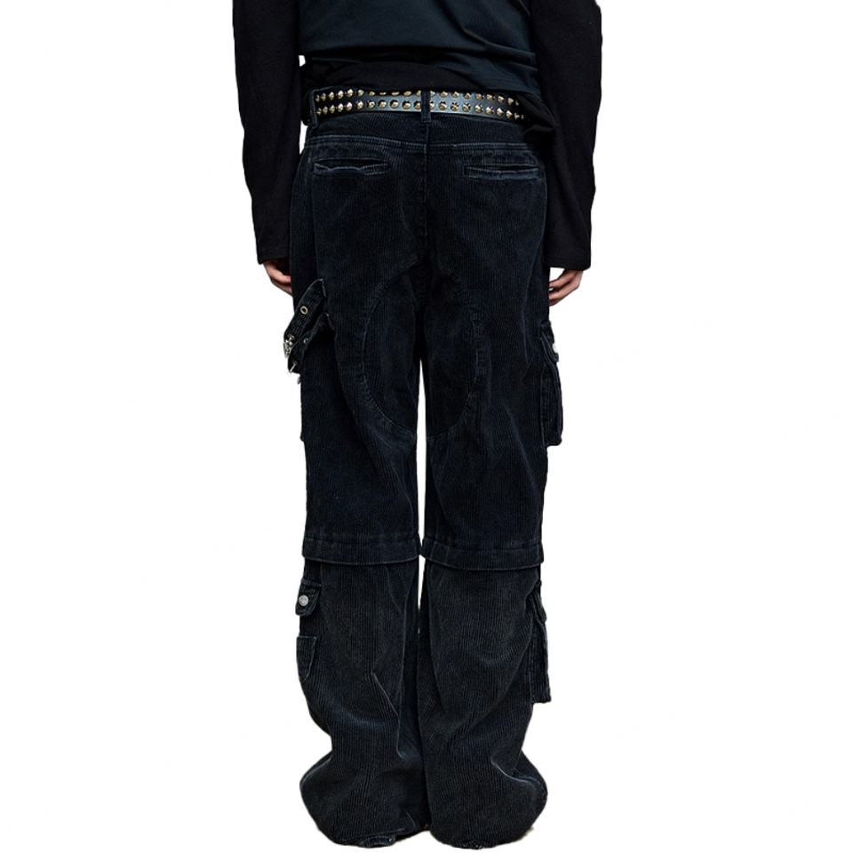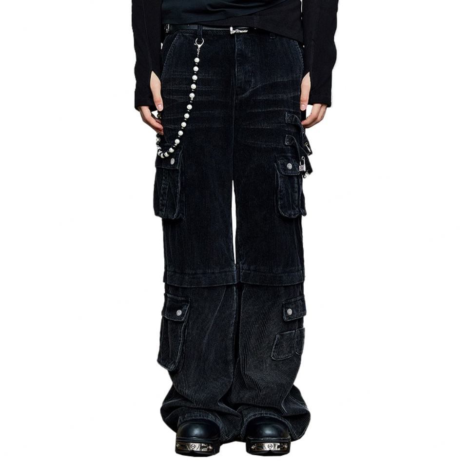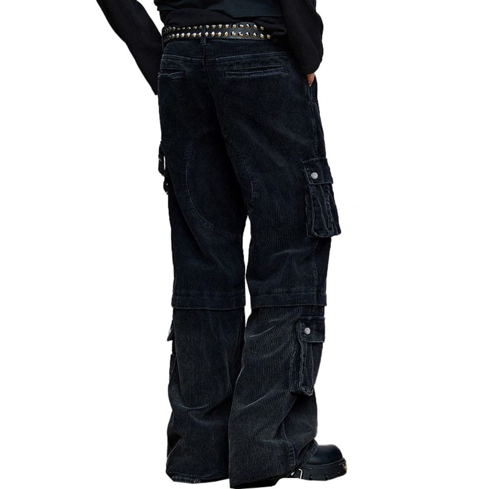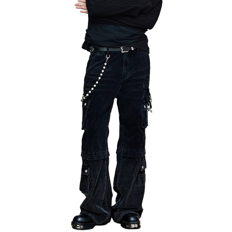 Wholesale Fashion Loose 100% Cotton Corduroy Men's Straight Leg Pants Street Wear Custom Hardware Black Washed Men's Cargo Pants