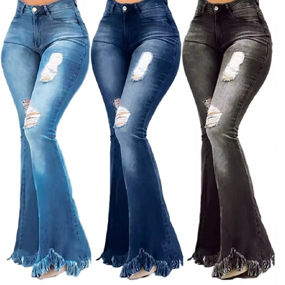กางเกงยีนส์แฟชั่นขายส่งทรงสกินนี่แบบขาดรุ่ย เอวสูง ทรงขาบาน
