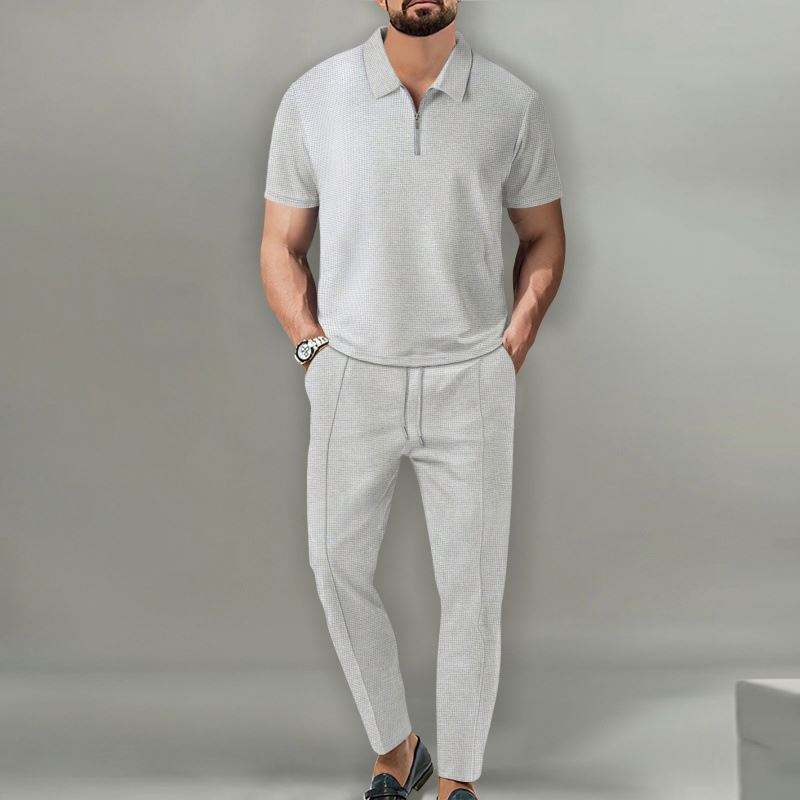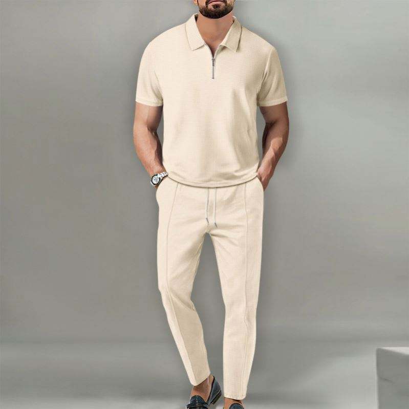 ชุดเซ็ตเสื้อผ้าผู้ชายแฟชั่นสตรีทแวร์ลำลองสองชิ้นสำหรับฤดูร้อน สีพื้น คอเต่า แขนสั้น ซิป ชุดกางเกงขายส่ง