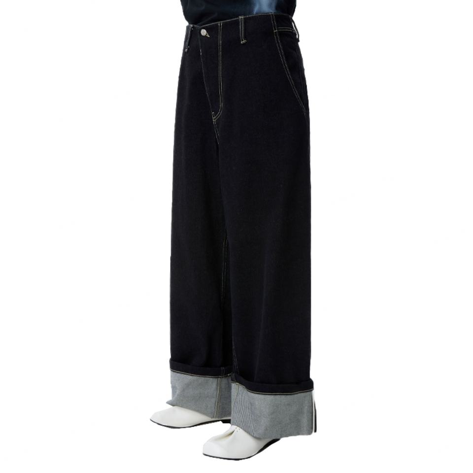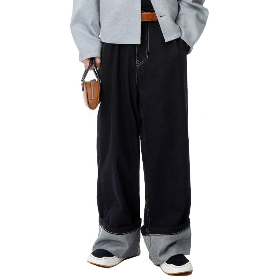 กางเกงยีนส์ทรงแบ็กกี้ชายสีดำขอบริมม้วนสไตล์สตรีทแฟชั่นขายส่ง