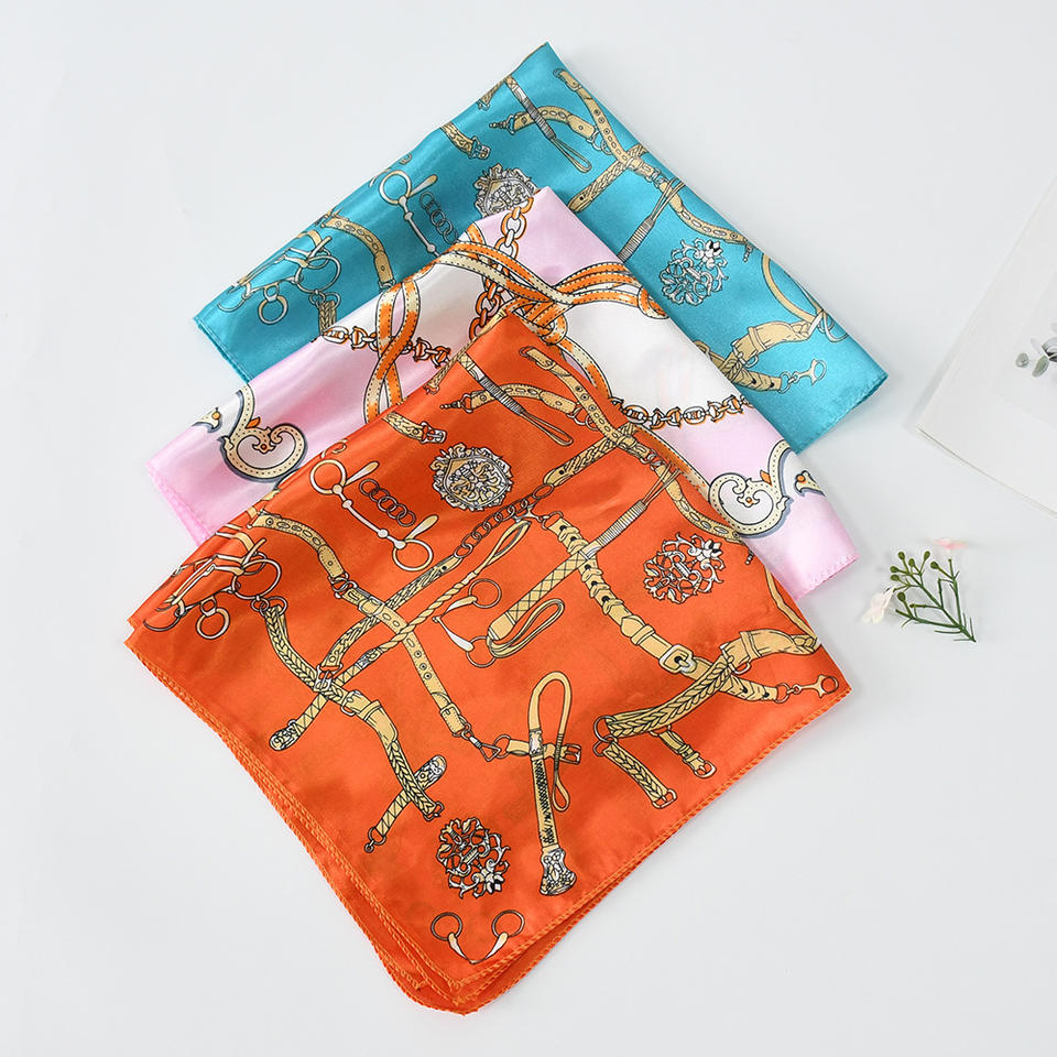 ผ้าพันคอผ้าไหมโพลีเอสเตอร์สี่เหลี่ยมผืนเล็กสำหรับ YKH0084ผู้หญิงลายดอกไม้ห่วงโซ่โลโก้ออกแบบได้ตามต้องการขนาด50ซม. ทันสมัย