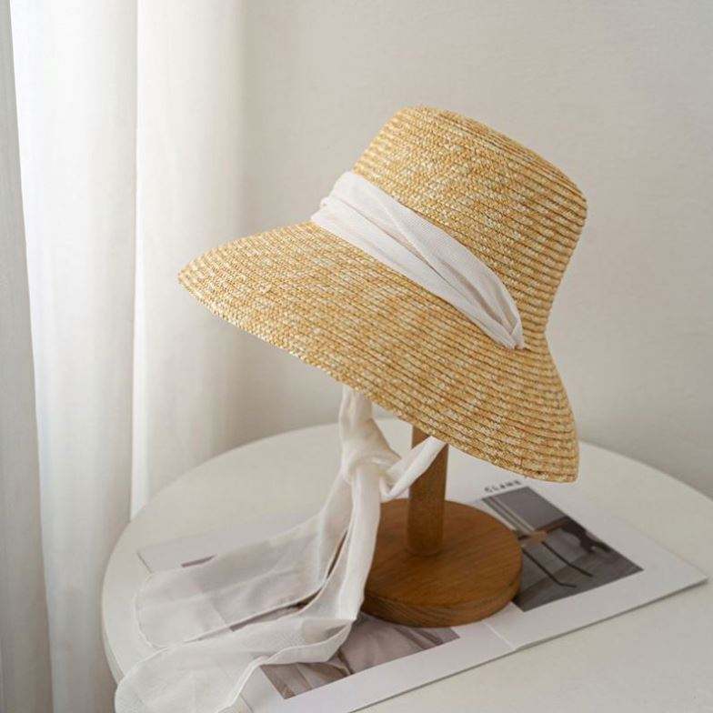 หมวกสานฟางสำหรับผู้หญิงขายส่ง พร้อมริบบิ้นผ้าซาติน หมวกชายหาดฟางข้าวสาลี หมวกปีกกว้างกันแดดสำหรับผู้หญิง