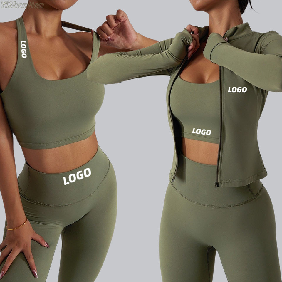 ชุดออกกำลังกายผู้หญิงขายส่ง เสื้อผ้าฟิตเนส กางเกงโยคะยกกระชับสะโพก เสื้อแขนยาว ชุดออกกำลังกาย 3 ชิ้น