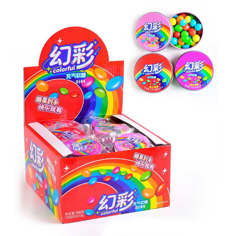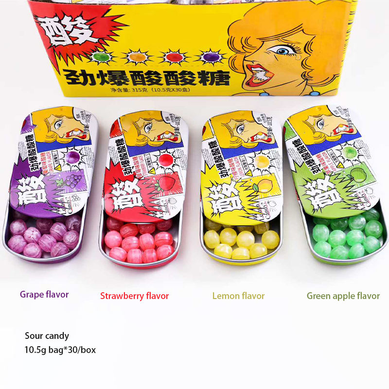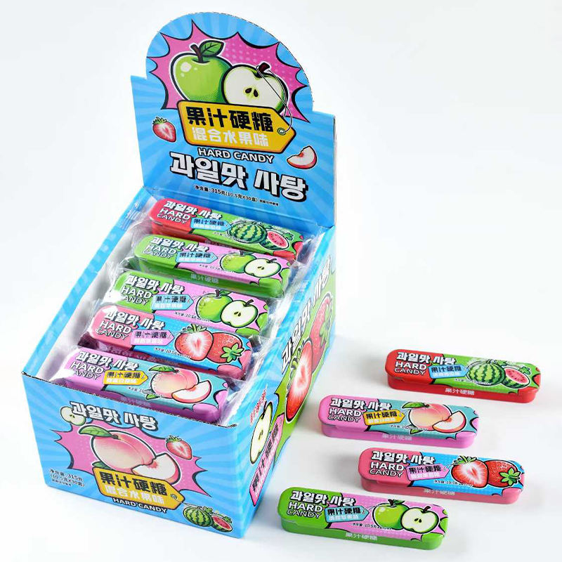 ลูกอมผลไม้รวมรสชาติหลากหลาย บรรจุในกล่องเหล็กขนาดเล็ก ลูกอมแข็งหลากสี ลูกอมรสเปรี้ยว ขายส่ง