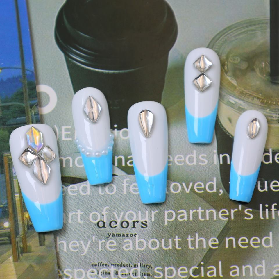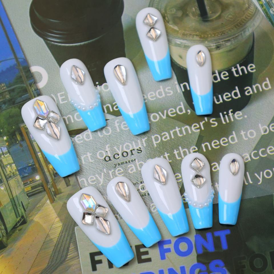 เล็บปลอมอะคริลิคแบบเต็มเล็บทรงโลงศพ งานแฮนด์เมด หรูหรา ลายผีเสื้อ 3 มิติ ปลายเล็บแบบฝรั่งเศส คุณภาพสูง ขายส่ง