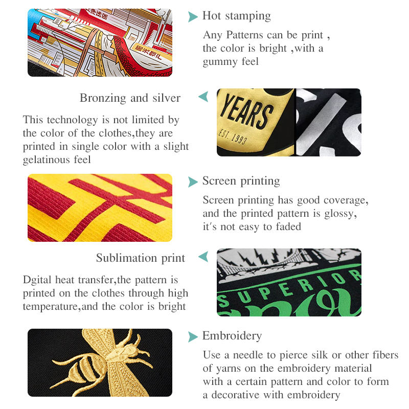 พิมพ์ออกมา, มัดย้อม, พิมพ์พัฟ, ลายนูน, การพิมพ์แบบถ่ายโอนความร้อน, การพิมพ์แบบดิจิตอล, การพิมพ์สเปรย์, การพิมพ์สกรีนผ้าไหม, Ready-Made เครื่องแต่งกายฉีดตรงความร้อนการพิมพ์, Ready-Made เครื่องแต่งกายโดยตรงการพิมพ์ดิจิตอล, น้ำหยด, ยกยางพิมพ์