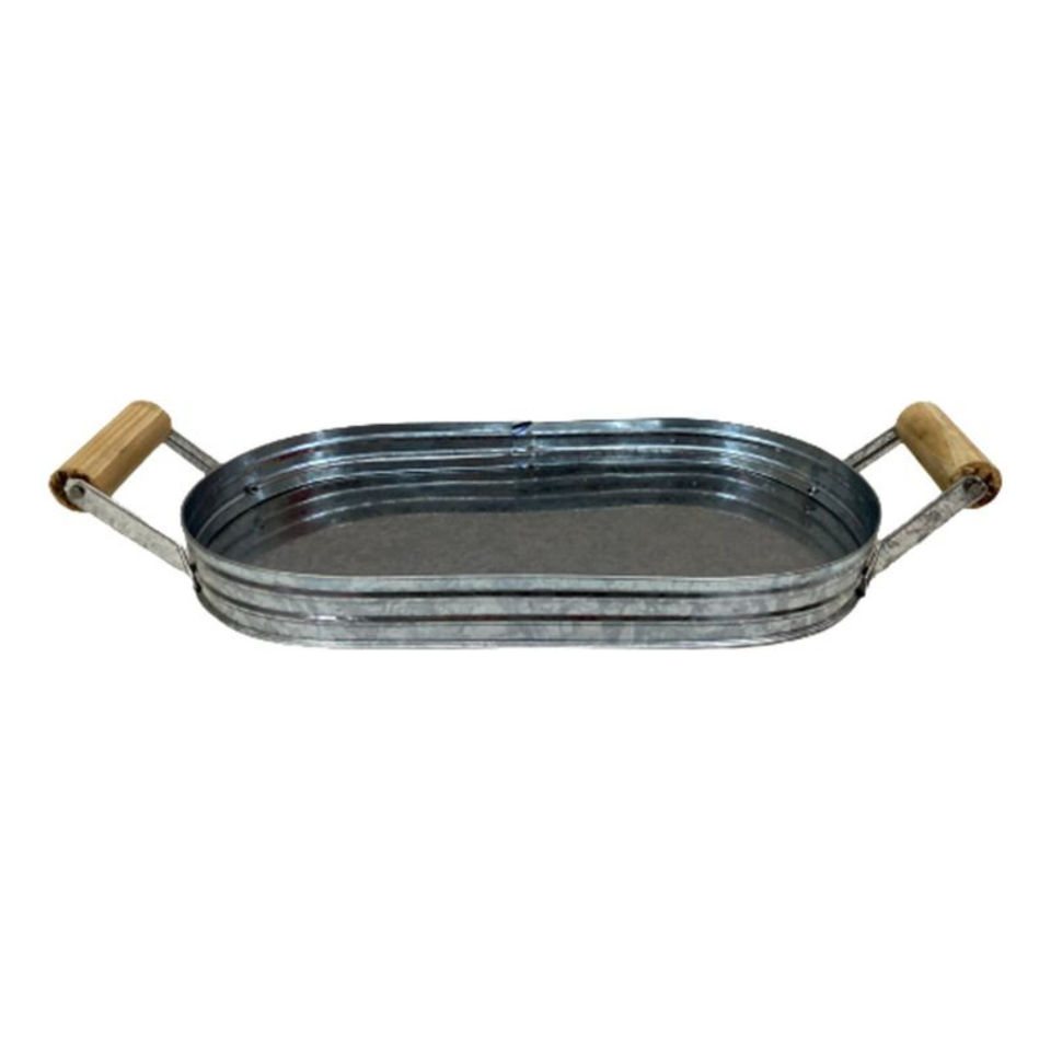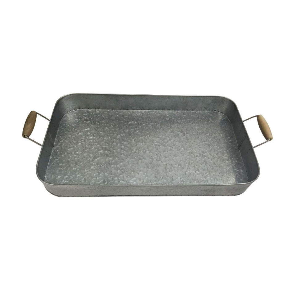 ถาดเสิร์ฟเหล็กชุบสังกะสีทรงสี่เหลี่ยมพร้อมหูจับไม้ ถาดโลหะตกแต่งสำหรับใช้ในครัว บ้าน และร้านอาหาร